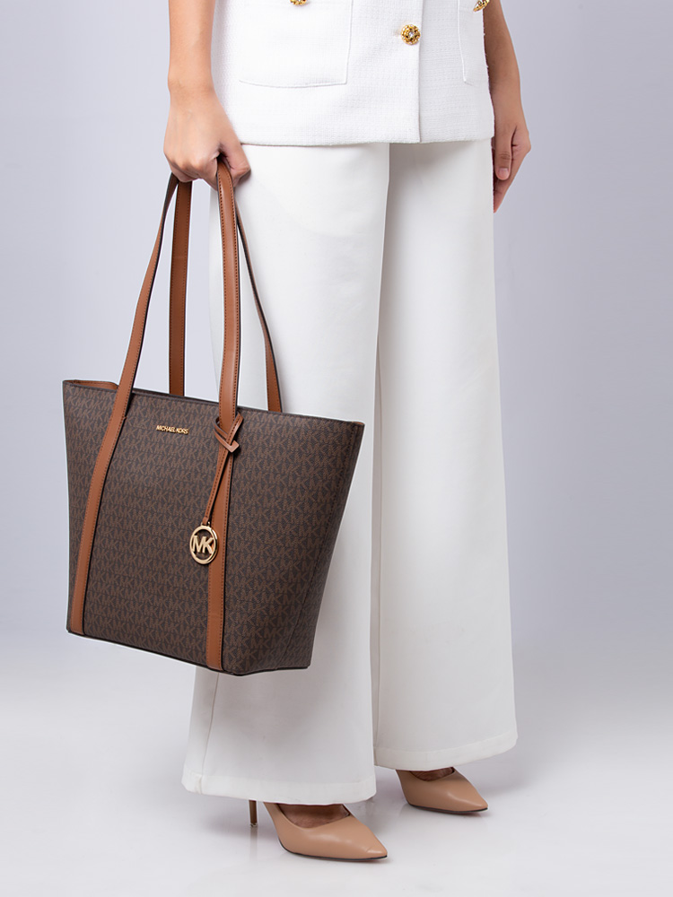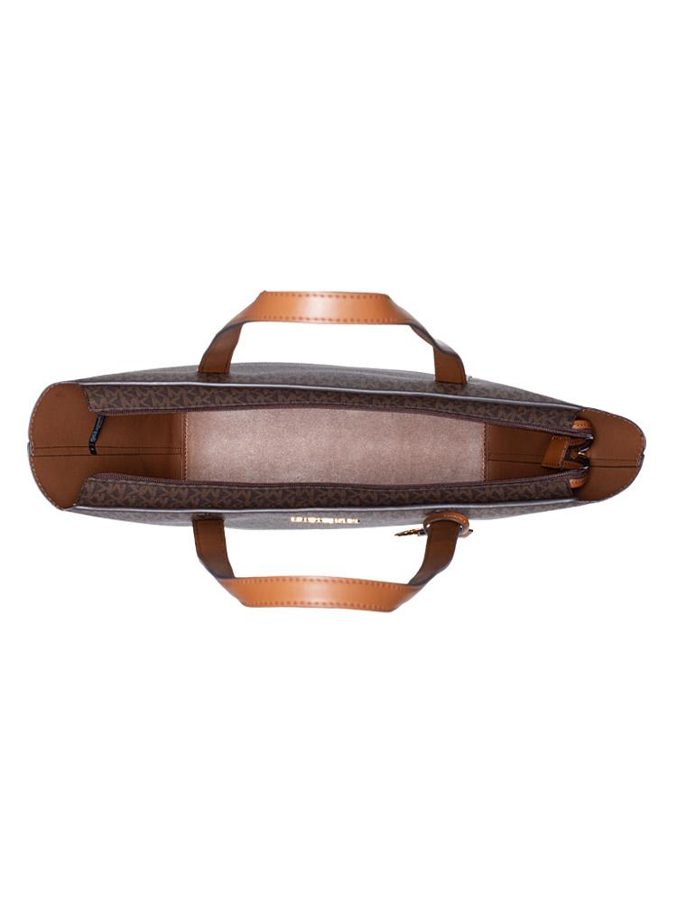 Made of signature coated canvas and smooth leather. The bag features a zip closure that opens to saffiano lining with interior two slip pockets.
