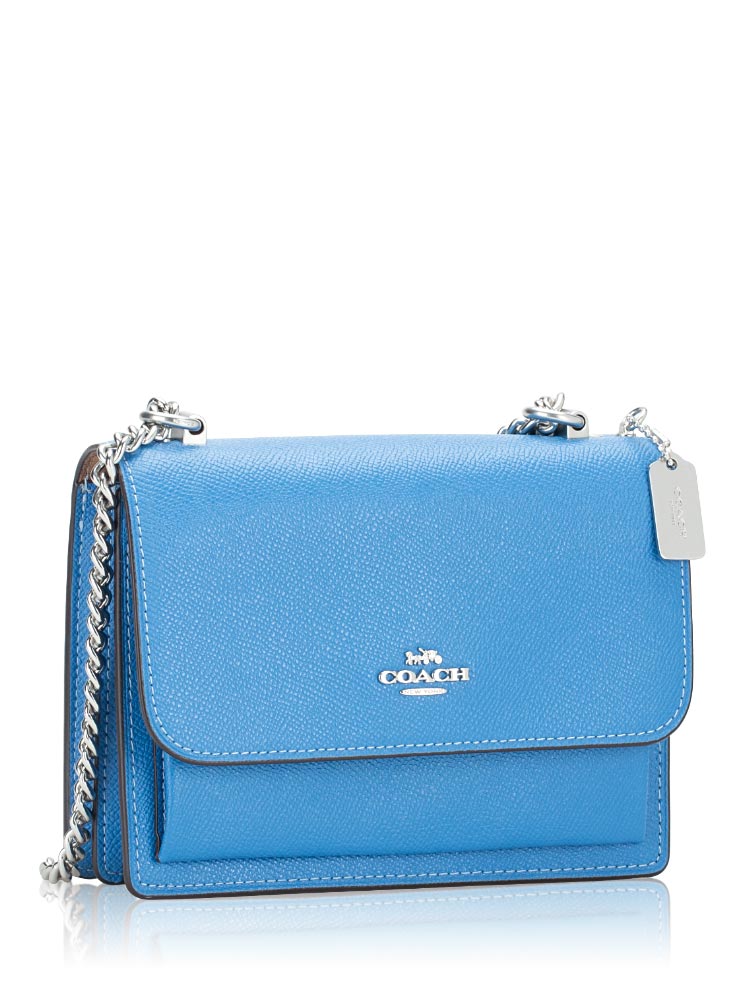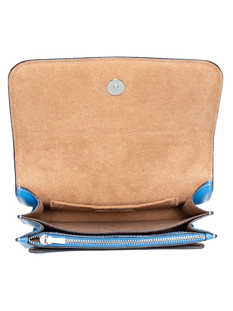 Made of crossgrain leather. The bag features a flap button magnetic closure that opens to suede lining with one slip pocket, one zip pocket, front slip pocket, exterior one slip pocket at back, chain shoulder strap.