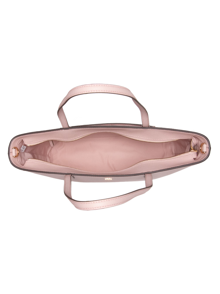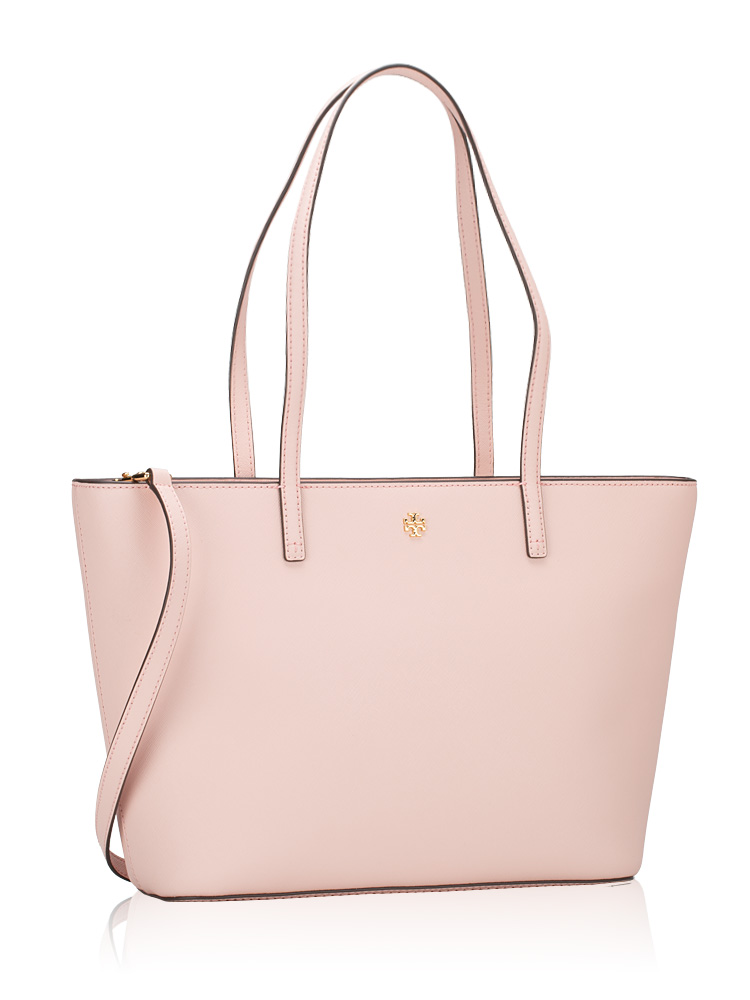 Made of saffiano leather. The bag features a zip closure that opens to fabric lining with interior one zip pocket, one slip pocket and exterior one slip pocket at back.