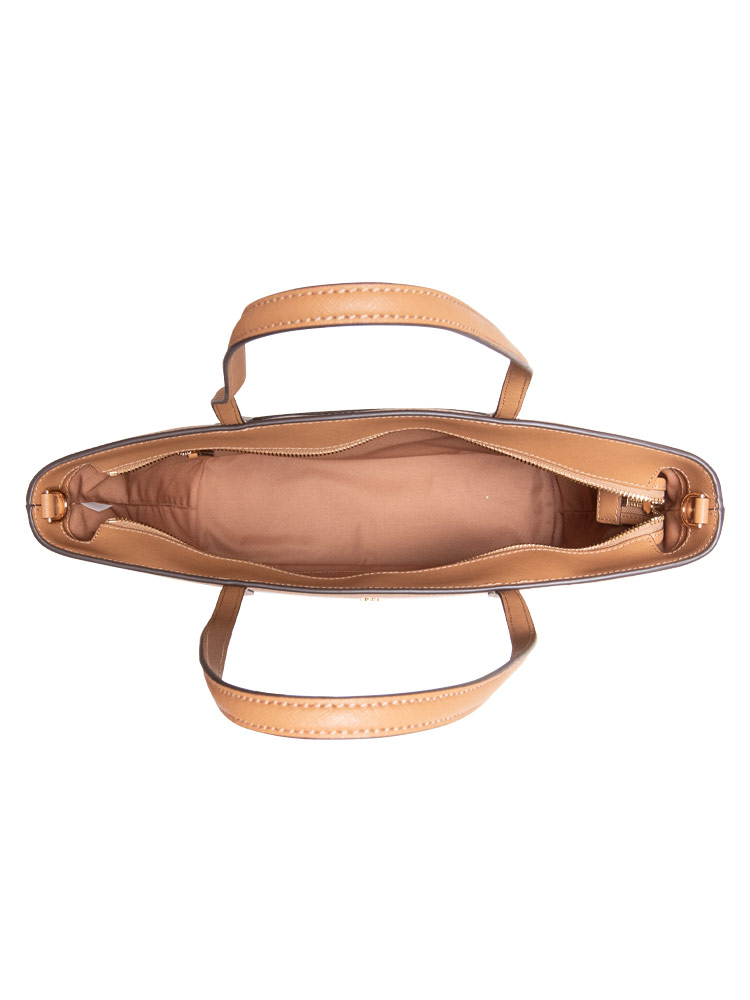 Made of saffiano leather. The bag features a zip closure that opens to fabric lining with interior one zip pocket, one slip pocket and exterior one slip pocket at back.
