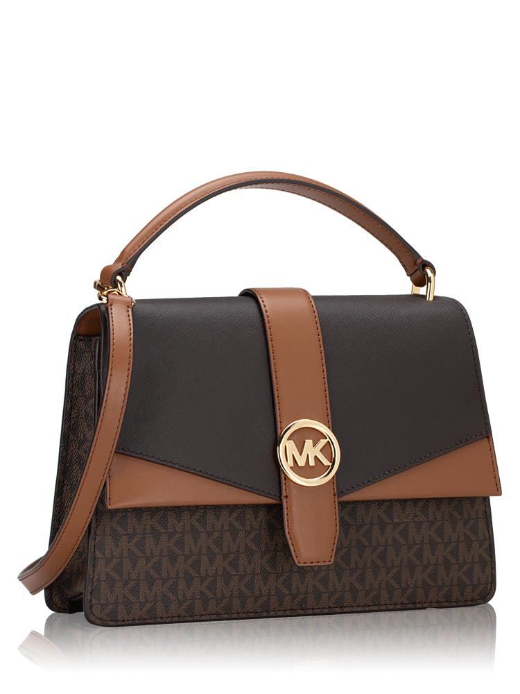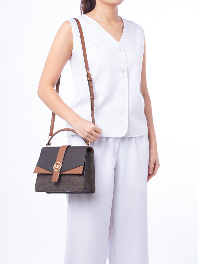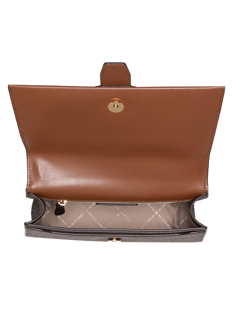 Signature coated canvas mix saffiano and smooth leather with polyester lining. The bag features an open button magnetic closure, gold tone hardware, one zip pocket, one slip pocket,and one rear eksterior slip pocket.