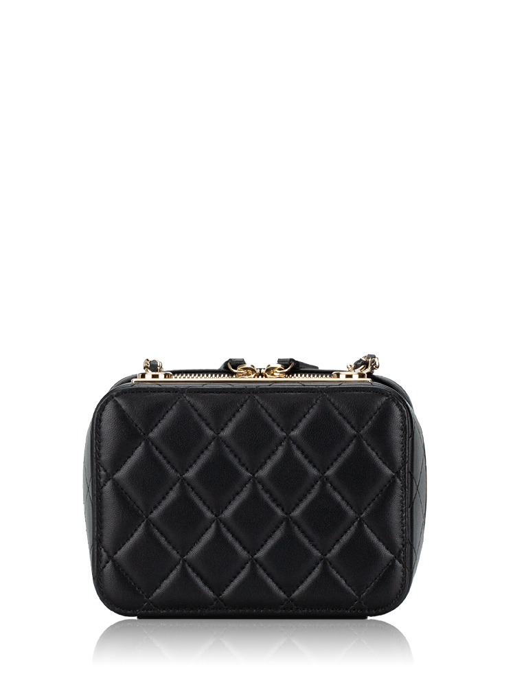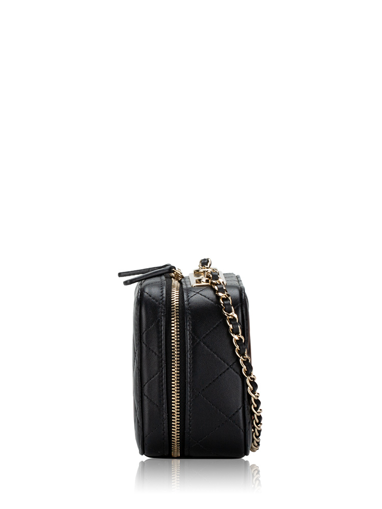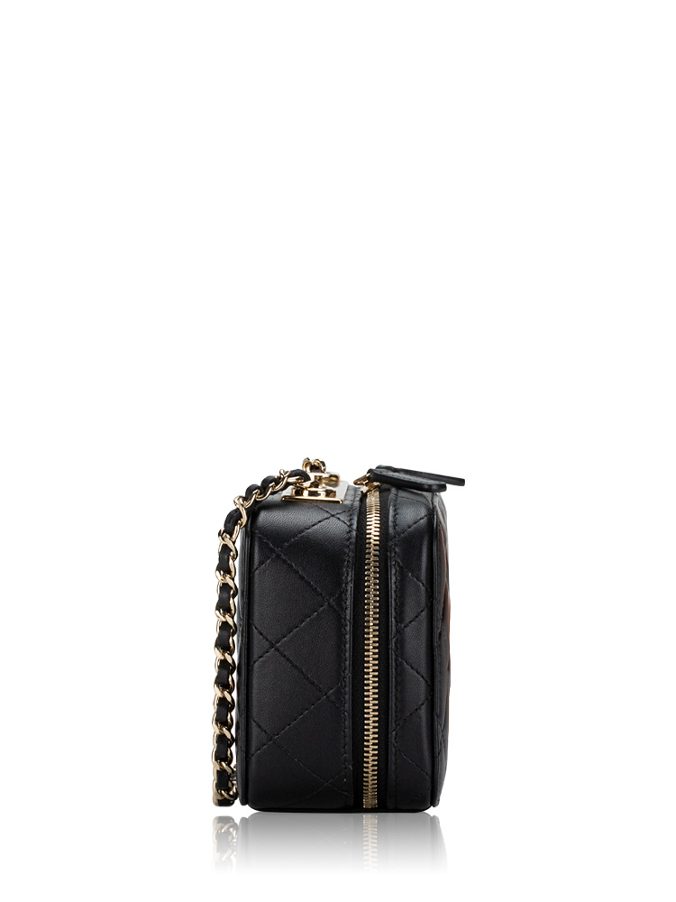 This crossbody is crafted of lambskin leather in black. The bag features a leather threaded gold chain-link shoulder strap and gold hardware. The handbag features a 3/4 wrap-around zipper that opens to a leather interior with card slots.