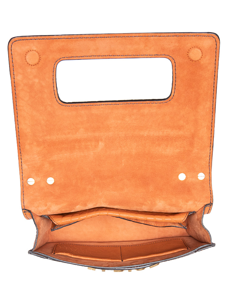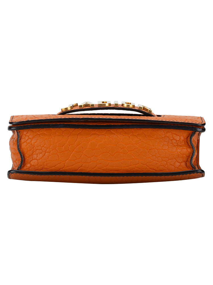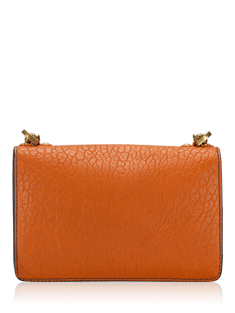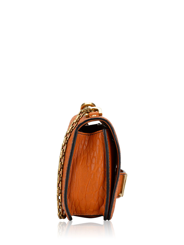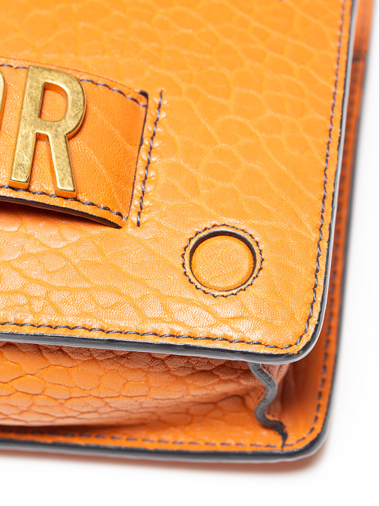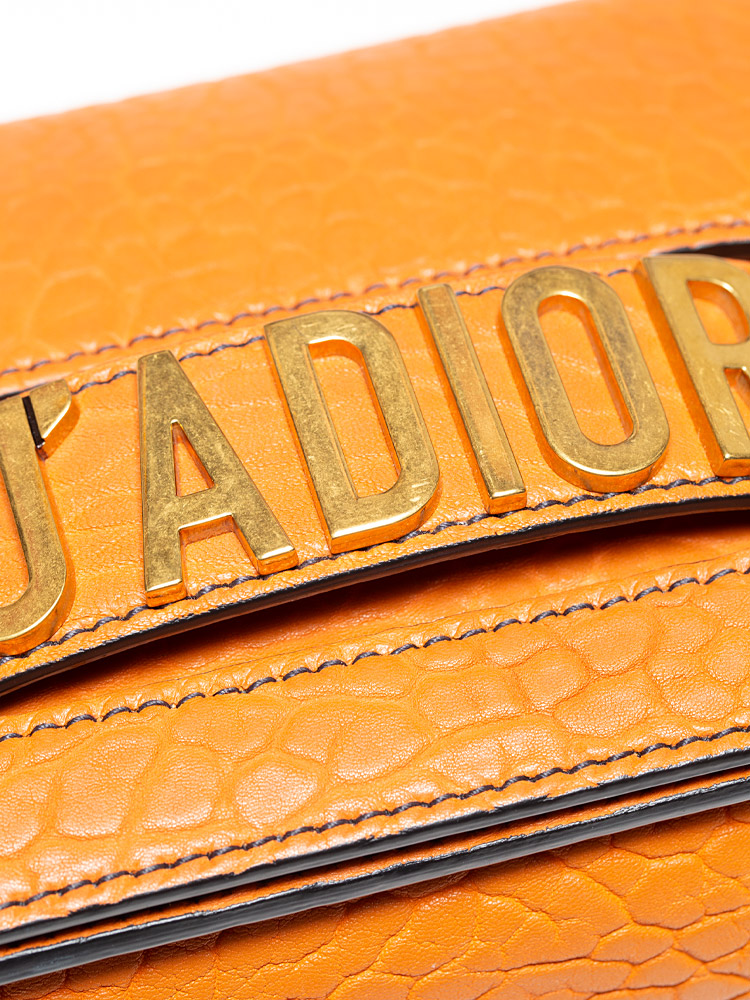 Crafted of grained lambskin leather. The bag features a gold chain link shoulder strap with the CD logo on each link and a leather front flap with the bold letters spelling J'adior. It opens to suede interior with an envelope pocket and patch pockets