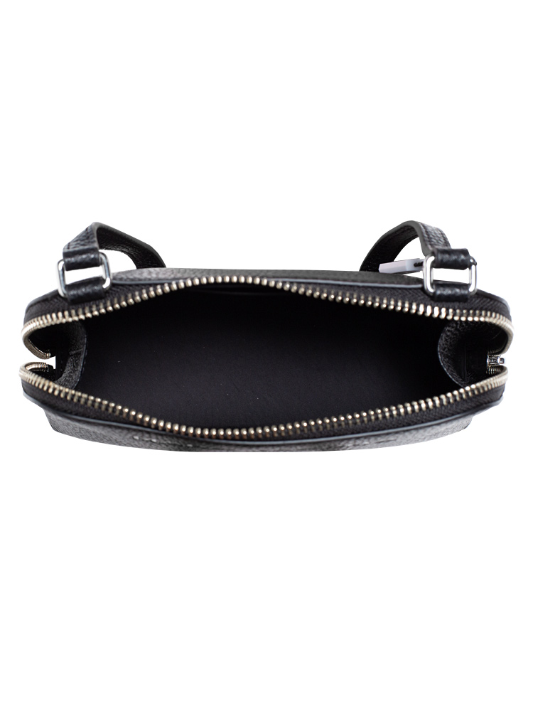 Made of pebble leather. The bag features a zip closure that opens to fabric lining with interior three card slots.