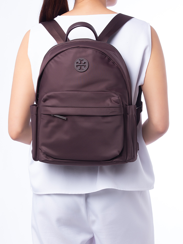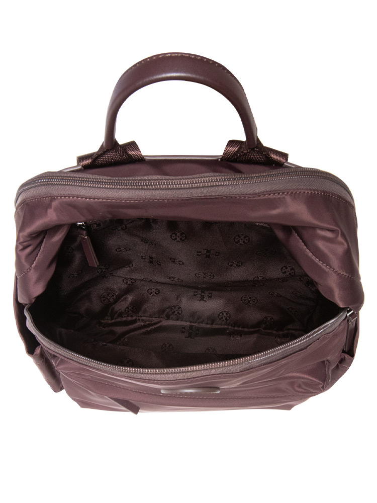 Made of nylon material. The bag features a zip closure that opens to jacquard lining with interior one zip pocket, one slip pocket and exterior one zip pocket at back, one zip pocket at front, two side slip pockets.
