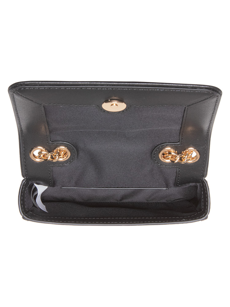 Made of calfskin leather. The bag features a flap magnetic closure that opens to fabric lining with two card slots, crossbody adjust shoulder chain strap.
