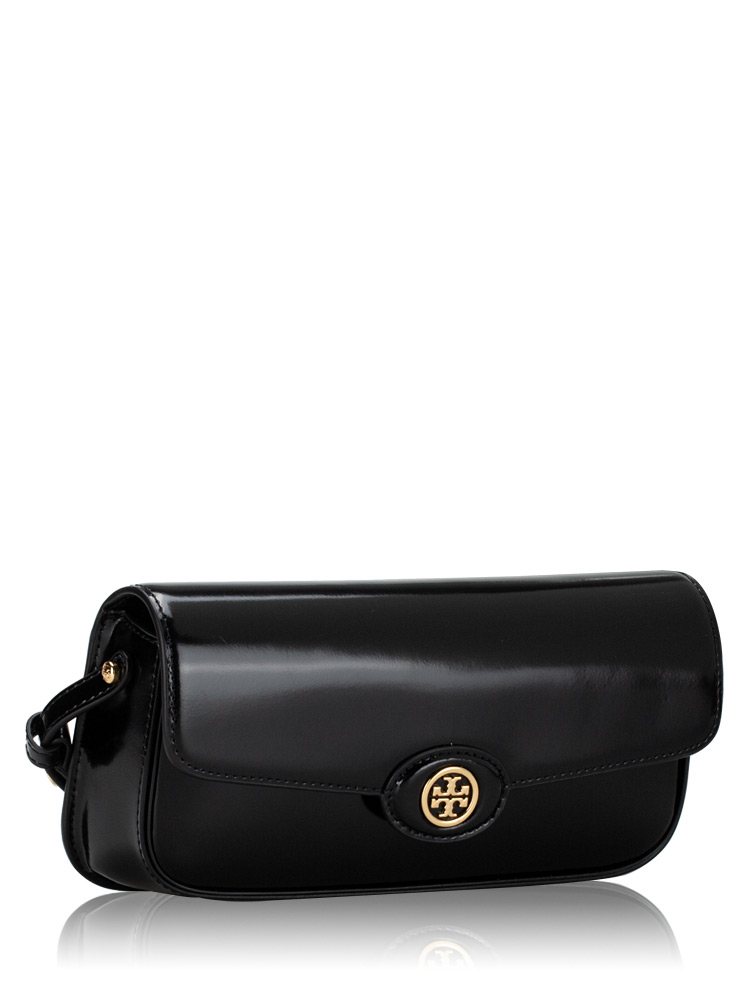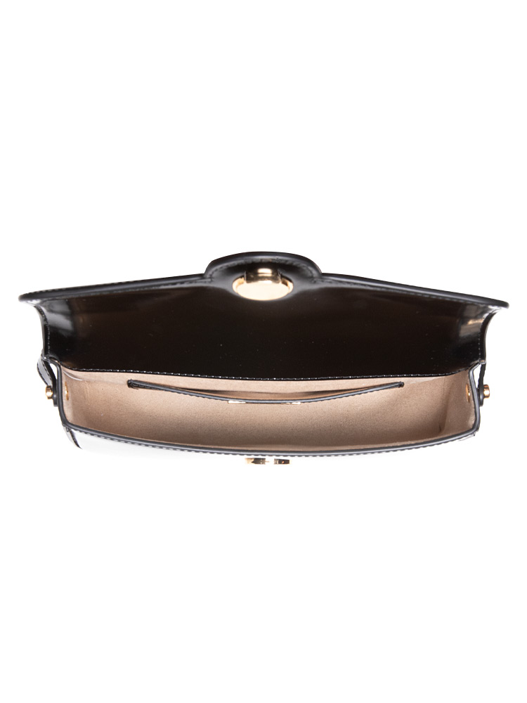 Made of patent leather. The bag features a flap magnetic closure that opens to suede lining with one slip pocket, exterior one slip pocket at back, adjustable strap.