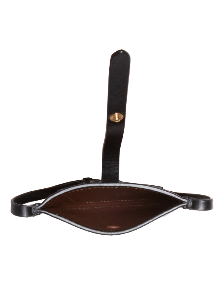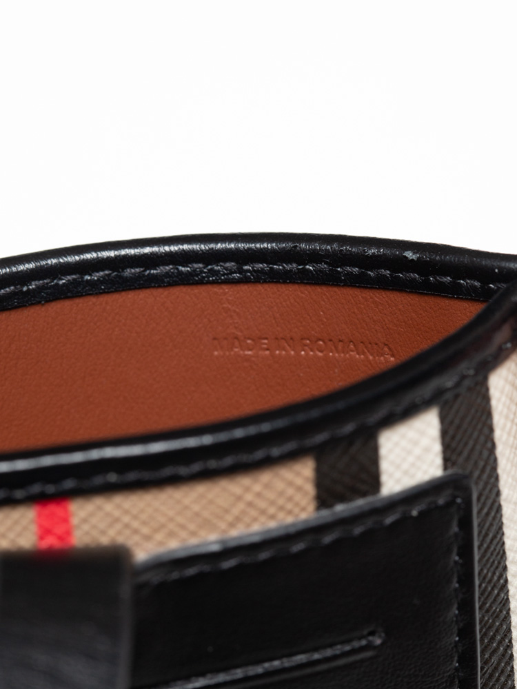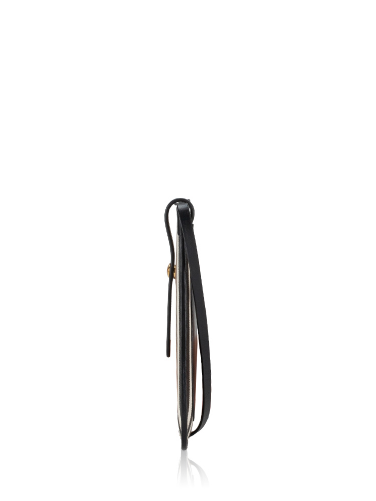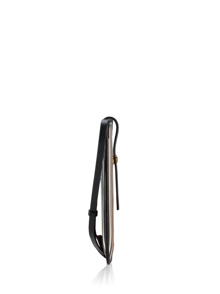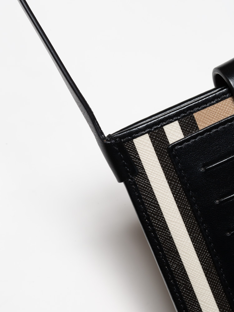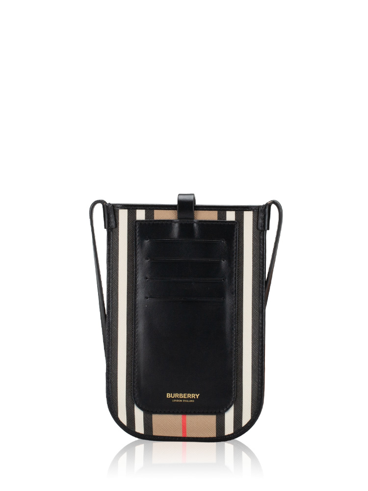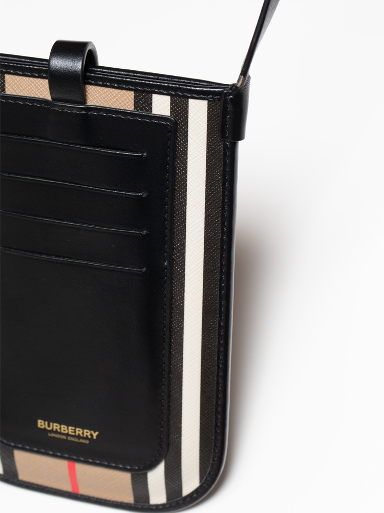This phone case is crafted of striped coated canvas with black leather trim. The bag features a thin leather shoulder strap, rear card slots, and gold hardware. The crossover strap opens to a brown leather interior.