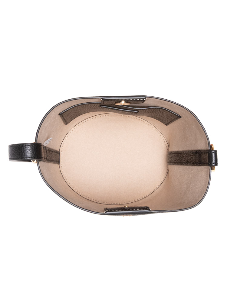 Made of pebbled leather. The bag features a magnetic closure that opens to suede lining with one slip pocket, adjustable strap.