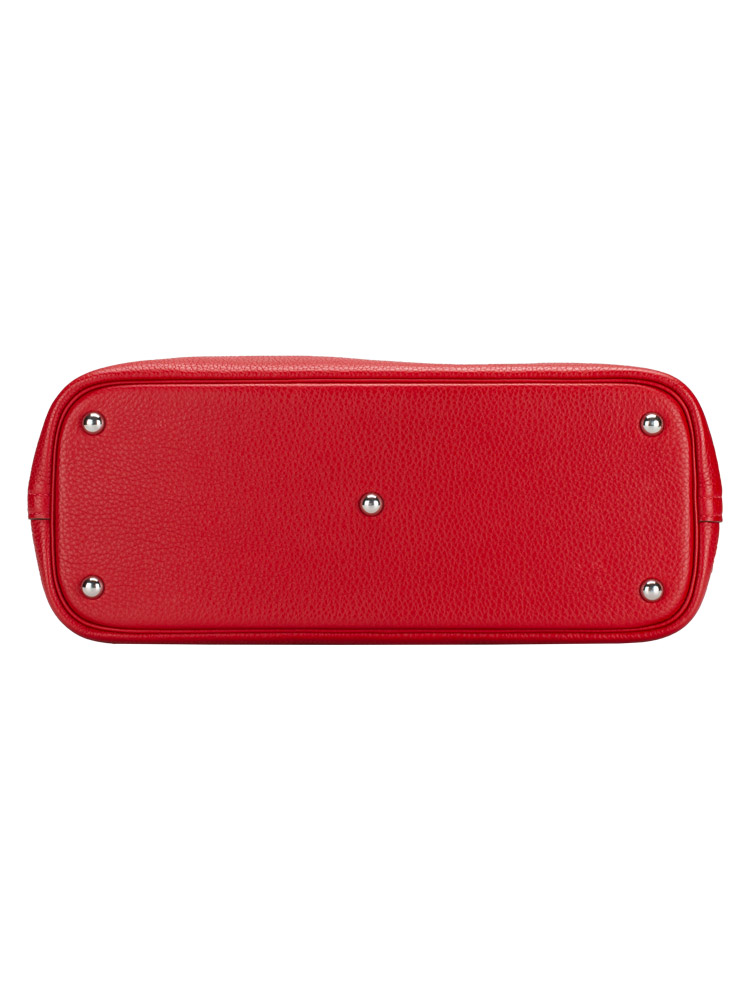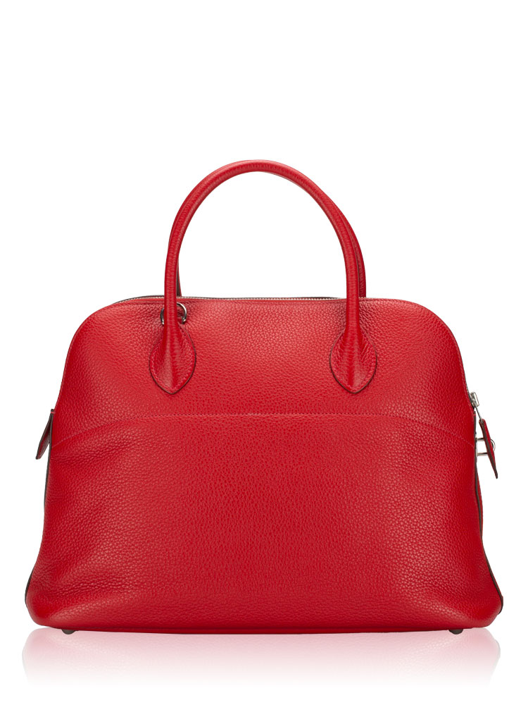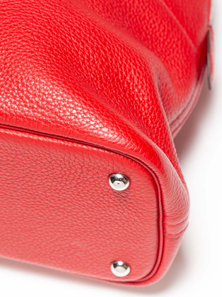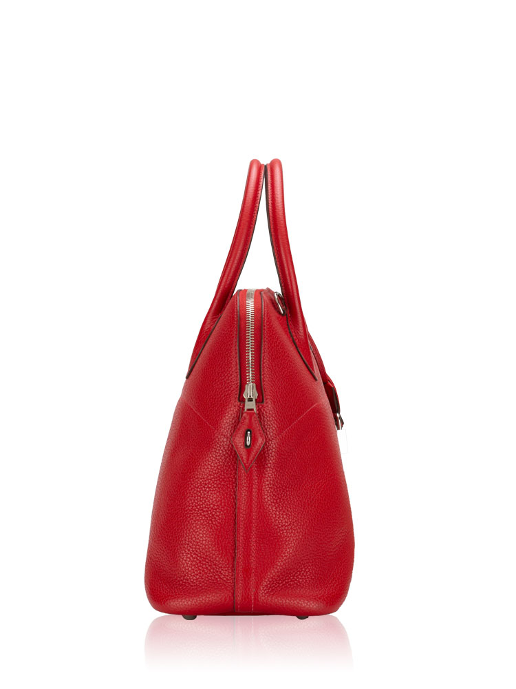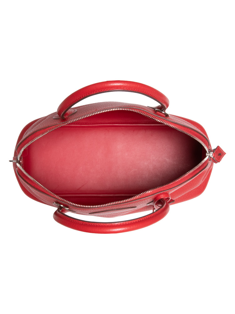 Crafted of clemence calfskin leather. It features top handles, an optional leather shoulder strap with palladium silver clasps, and a hanging clochette with keys for the padlock. The top zipper opens to a leather interior with a flat pocket.