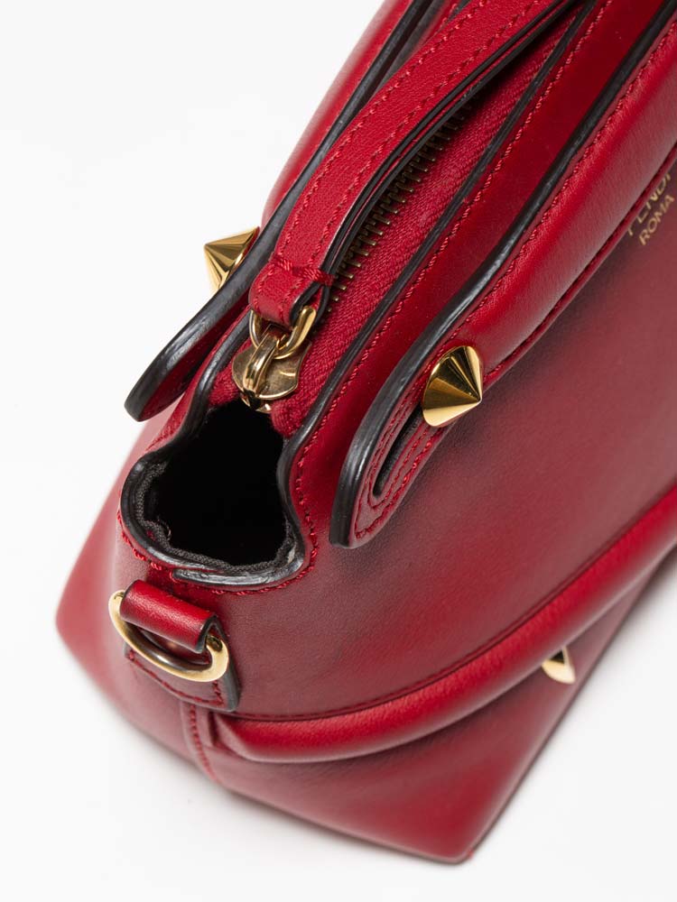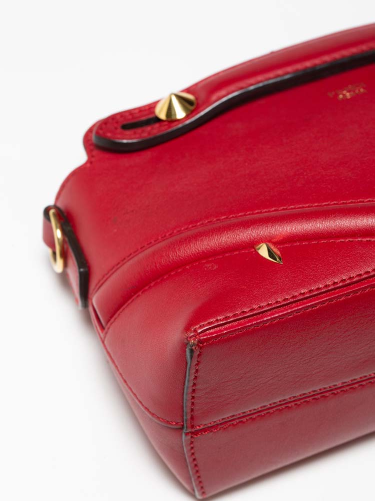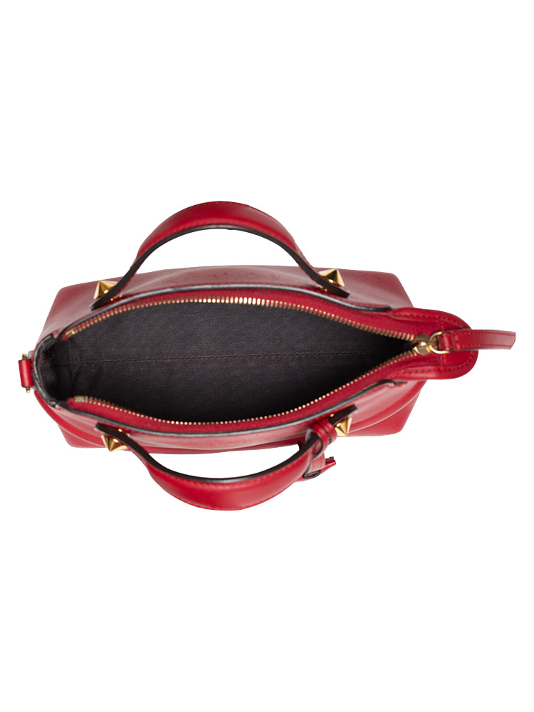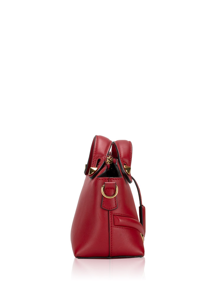 Crafted of calfskin leather. The shoulder bag features leather strap top handles with large pointed cone polished gold-tone studs and an optional shoulder strap with adjustable clasps.