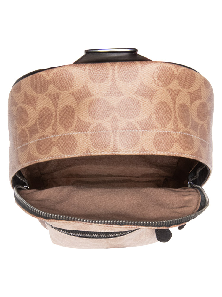 Made of signature coated canvas and smooth leather. The bag features a zip closure that opens to fabric lining with interior one slip pocket and exterior one zip pocket at front.