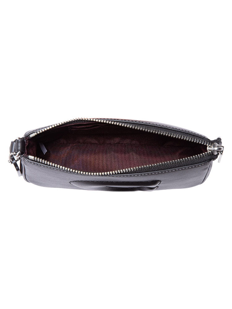 Made of smooth leather. The bag features a zip closure that opens to fabric lining with interior two card slots, strap drop 16 cm.