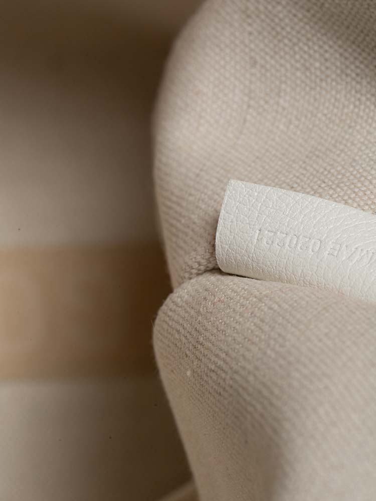 This structured tote is crafted of classic Goyard monogram chevron coated canvas in white. The bag features long leather shoulder straps, a unique print at the center of the front panel. The open top reveals a spacious beige fabric interior.