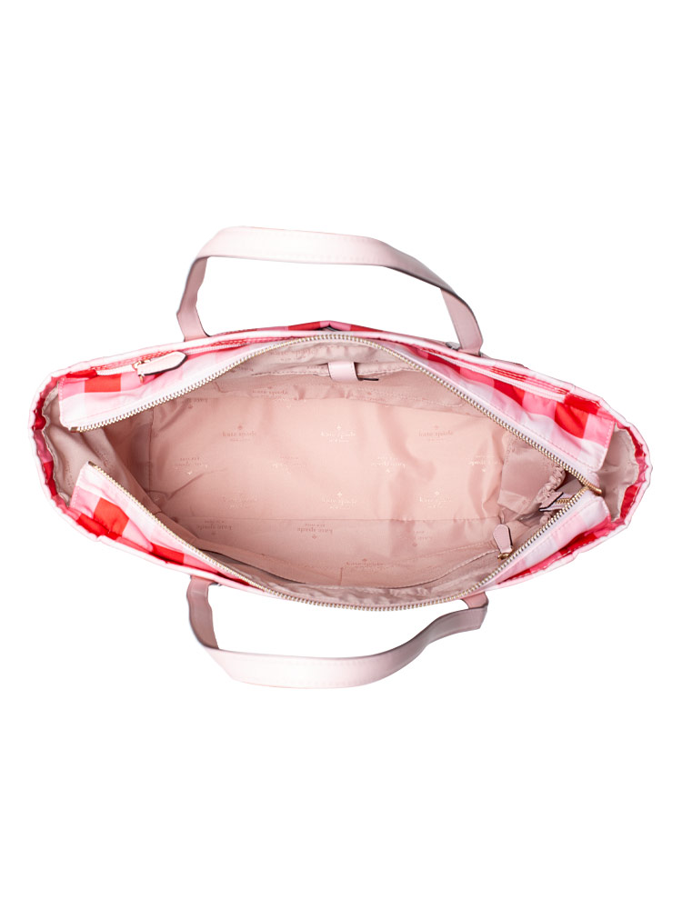 Made of nylon. The bag faetures a zip closure that opens to two way script logo lining with interior one zip pocket, three slip pockets, one slip pocket with button closure and exterior one zip pocket at front, one zip pocket at back.
