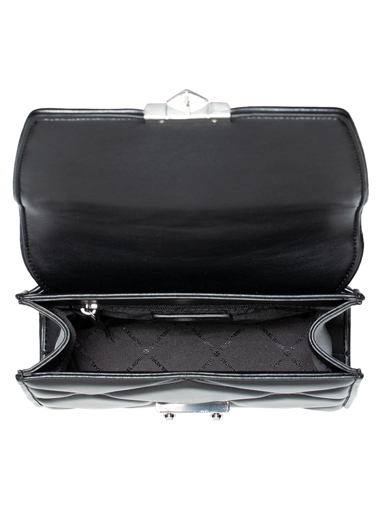 Crafted of quilted smooth leather, the bag features chain strap with leather shoulder pads. The flap with push lock closure leads to a fabric lining, a zipper pocket, and a slip pocket. It also has an exterior slip pocket for easier access.
