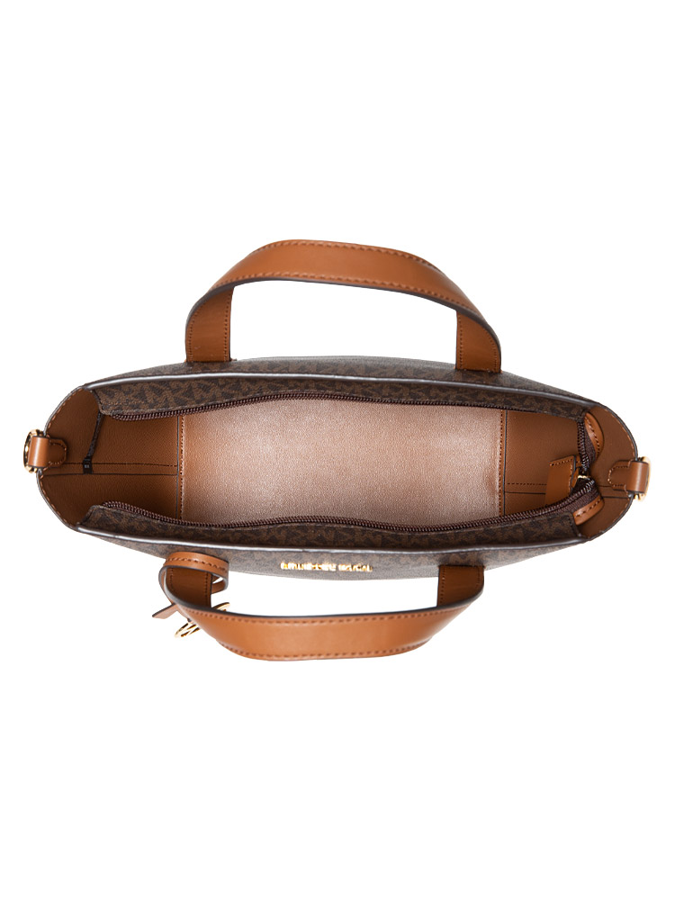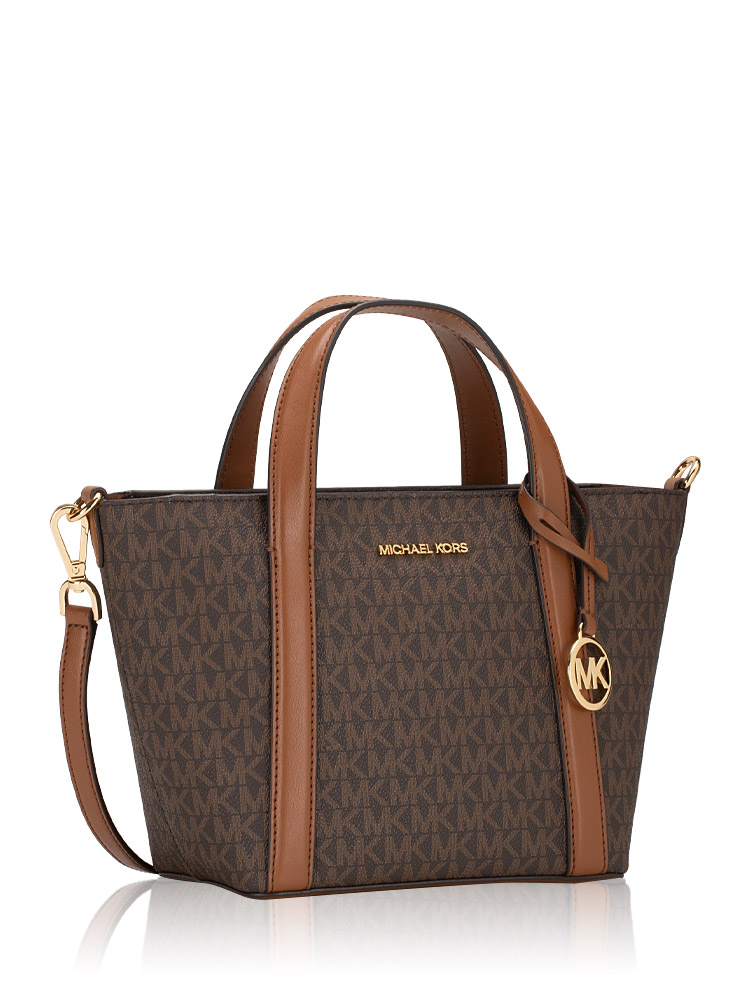 Made of signature coated canvas and smooth leather. The bag features a zip closure that opens to saffiano lining with two slip pocket, double handles drop 12 cm, adjustable and removable long strap.