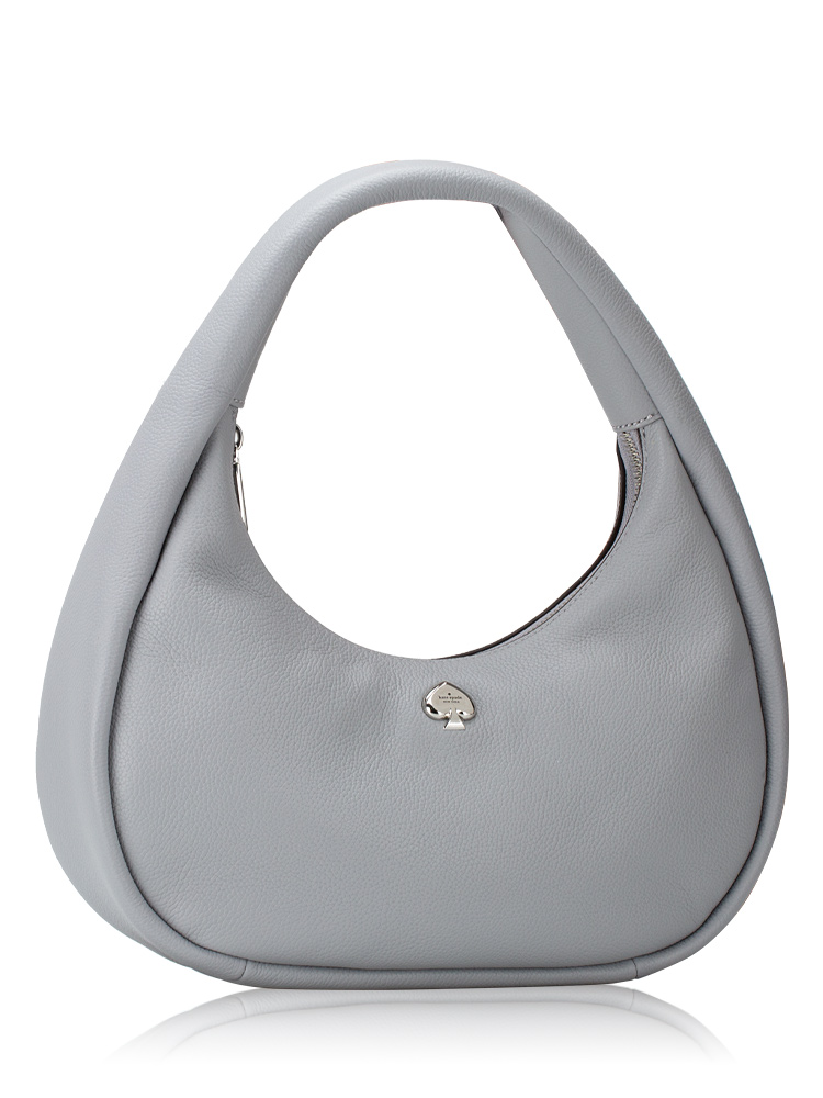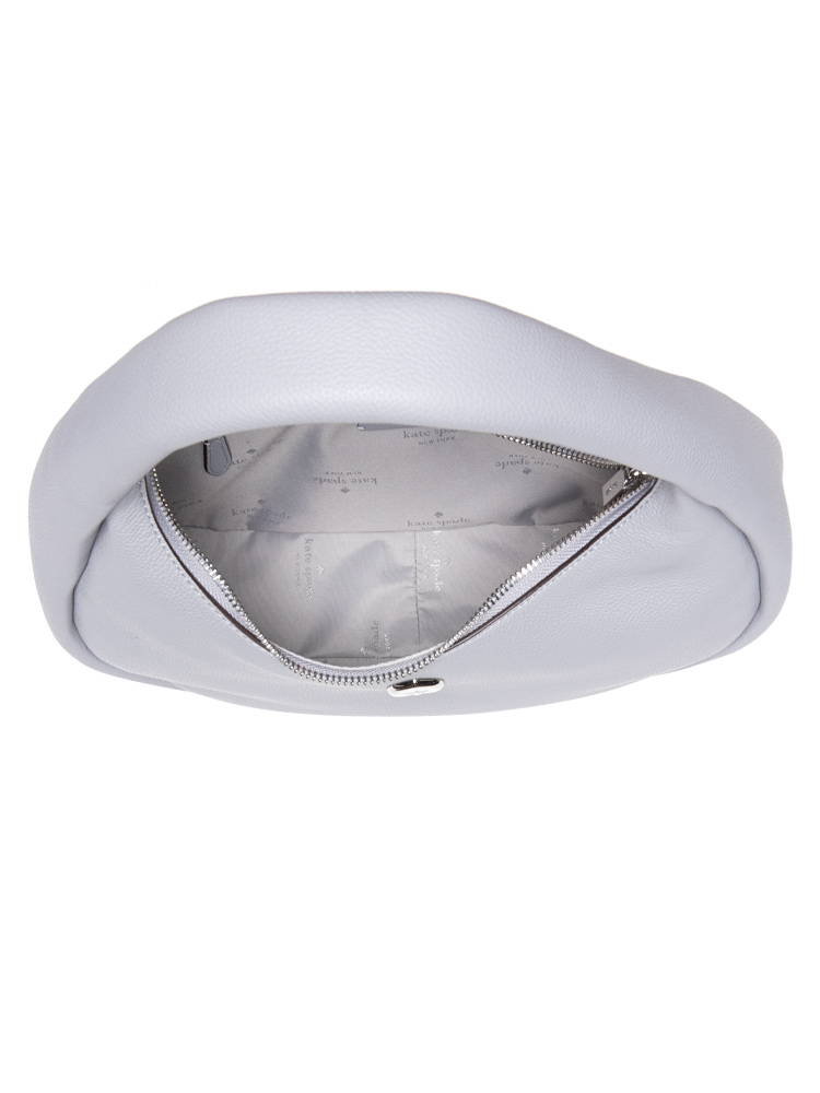 Made of pebbled calf leather with logo polyester lining interior. The bag features an open zip closure, silver tone hardware, one zip pocket and one slip pocket.