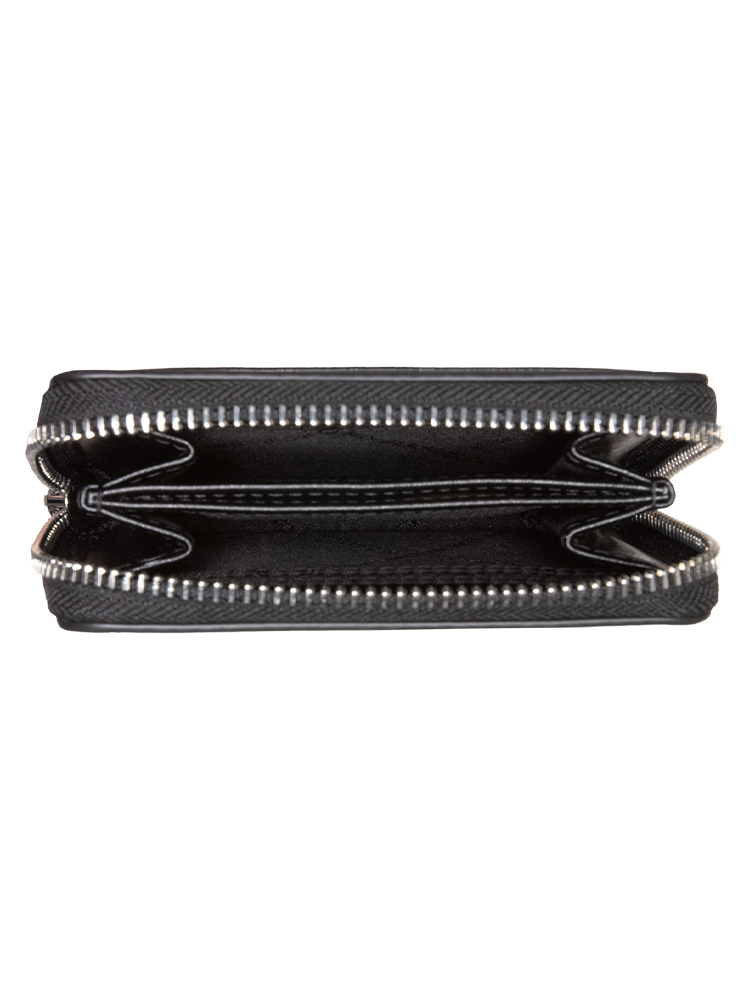 Created of saffiano leather, this card case features a zip around closure that opens to double medium compartments with a middle slip pocket and 4 card slots. It has other exterior card slots.