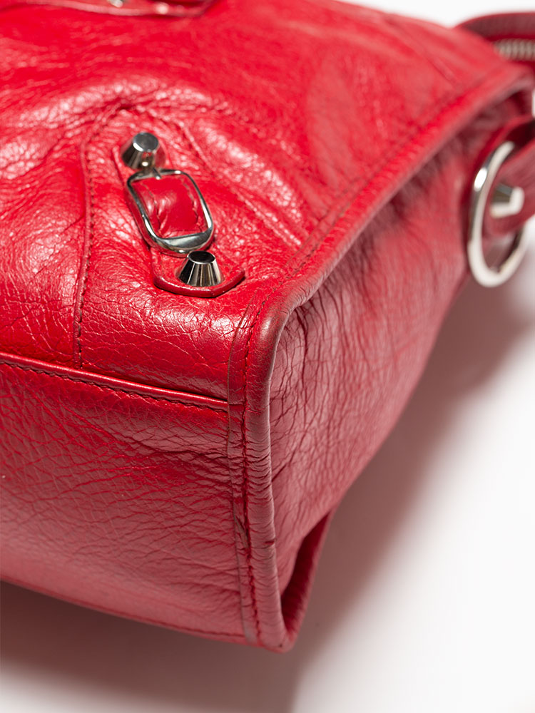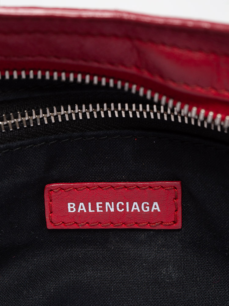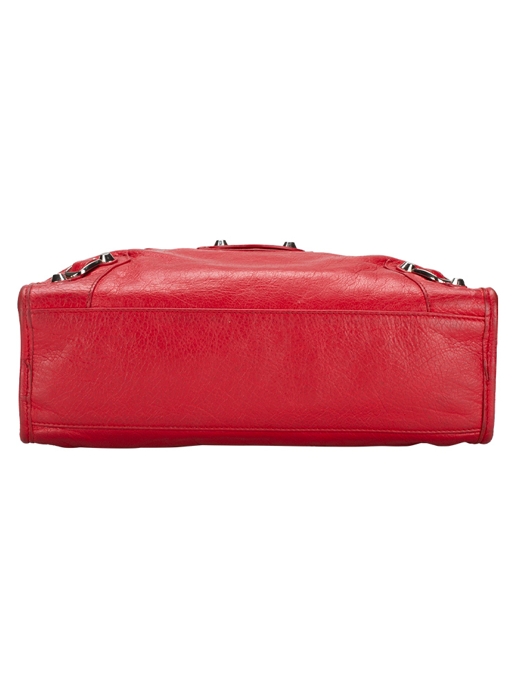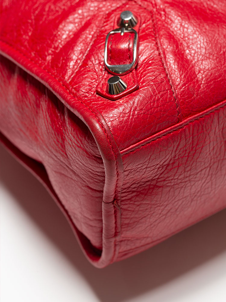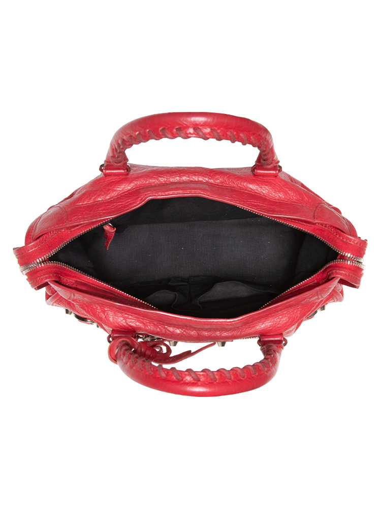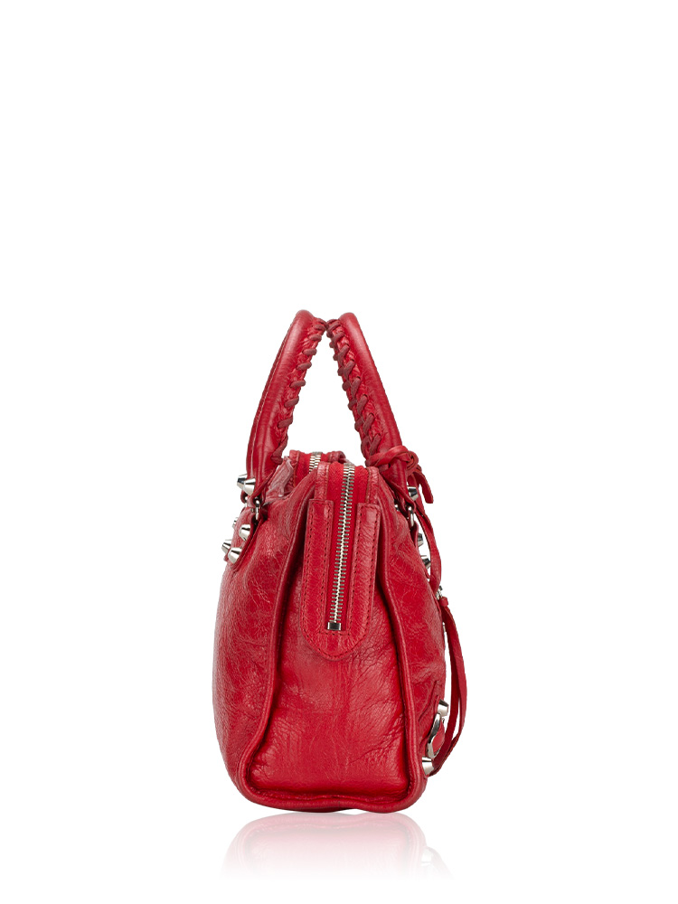 Crafted of lambskin material. This bag features rolled leather top handles with handwoven whipstitch detail, an optional, adjustable shoulder strap with the Balenciaga logo, and an exterior zipper pocket with a removable mirror.