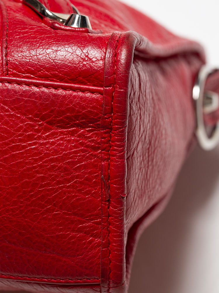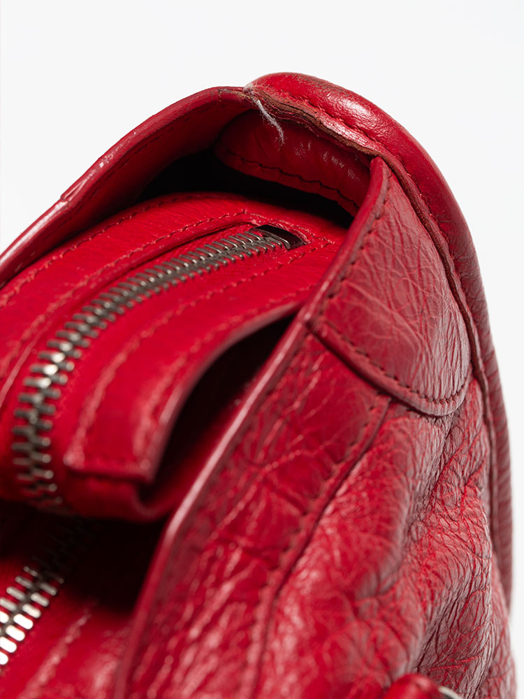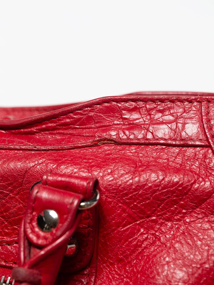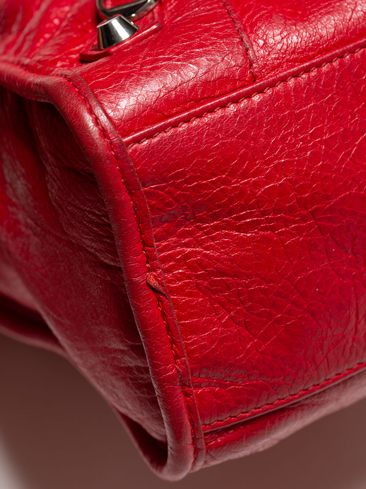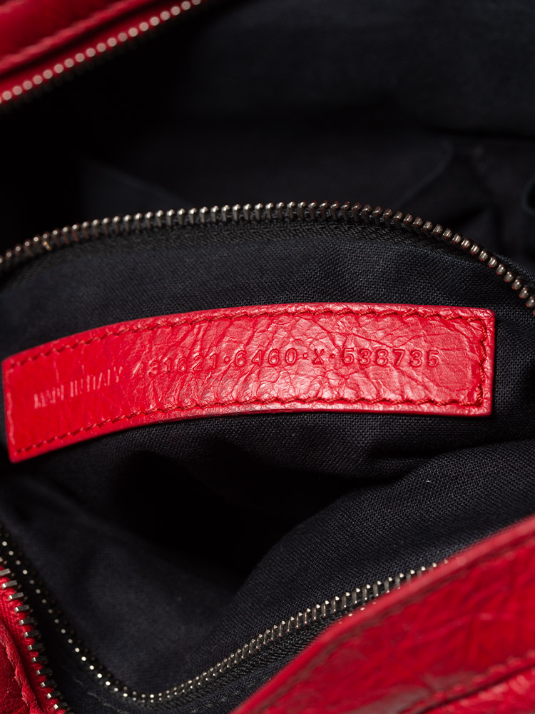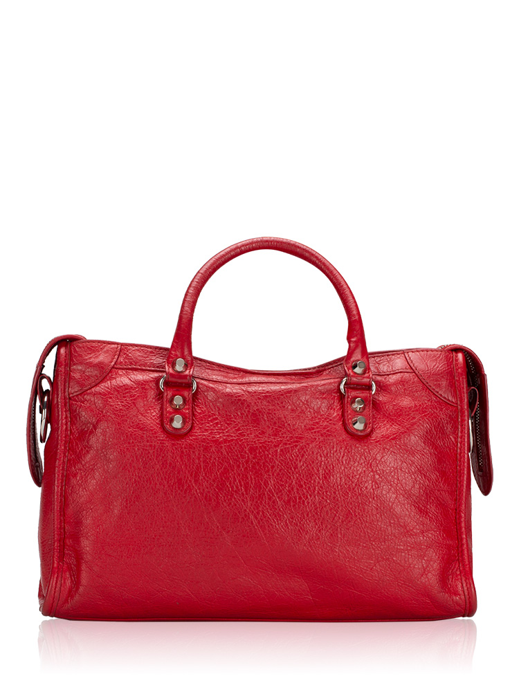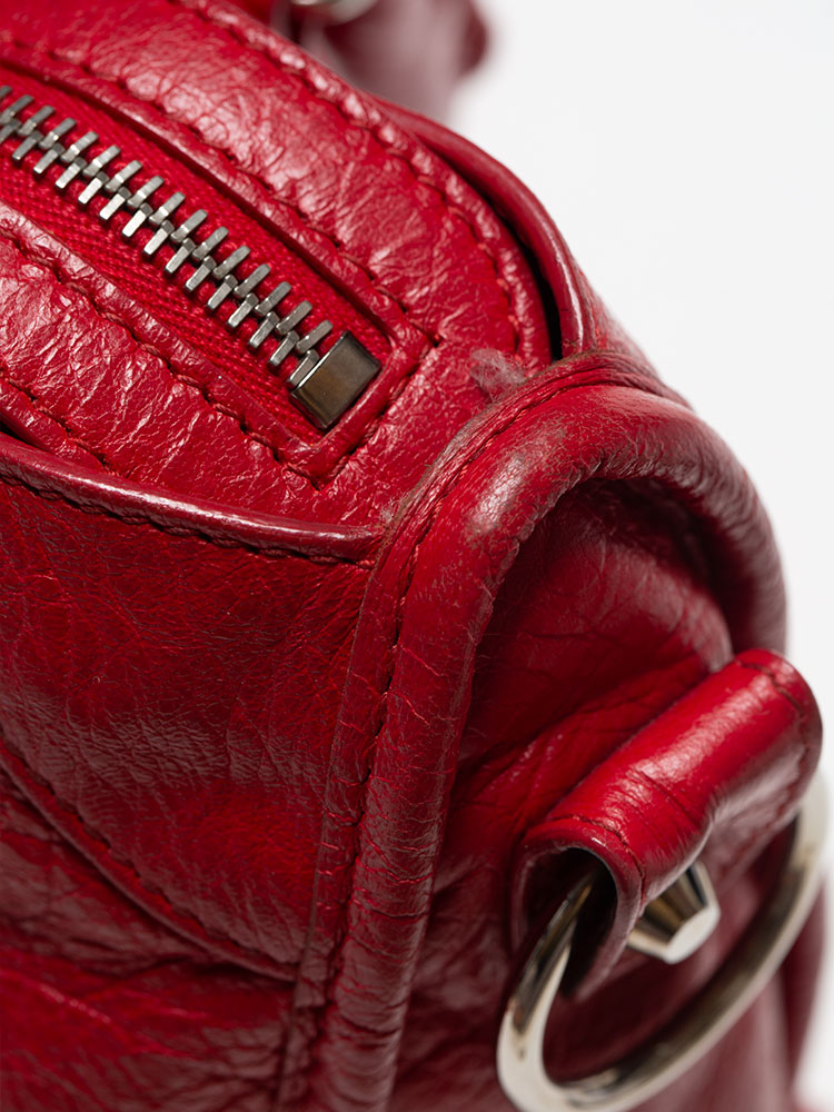 Crafted of lambskin material. This bag features rolled leather top handles with handwoven whipstitch detail, an optional, adjustable shoulder strap with the Balenciaga logo, and an exterior zipper pocket with a removable mirror.