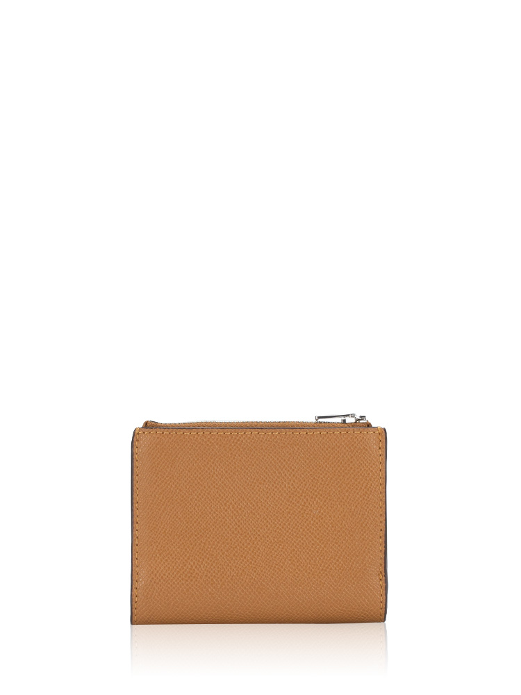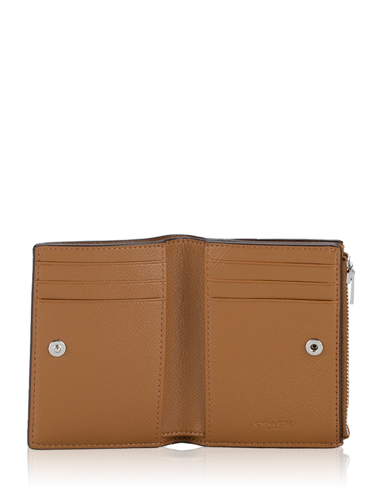 Made of crossgrain leather. The wallet features a button closure that opens to fabric lining with full length bill compartment, two slip pockets, six card slots and exterior one zip coin pocket.