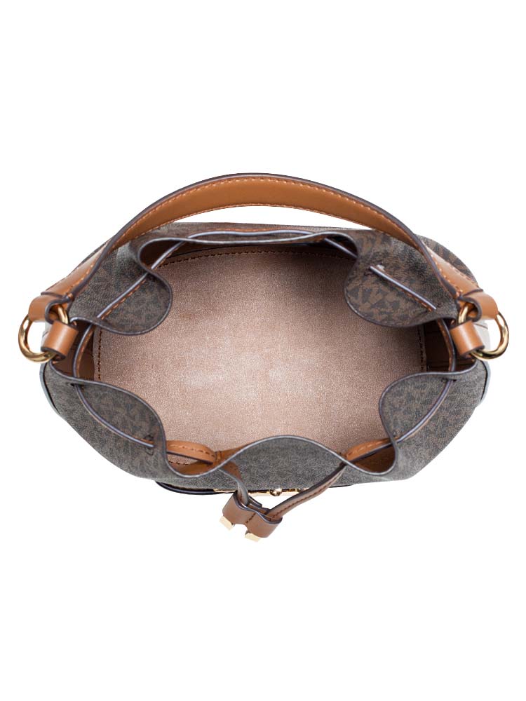 Crafted of signature coated canvas with leather. It features an open top with drawstring closure, top handle, a slip pocket and an optional strap