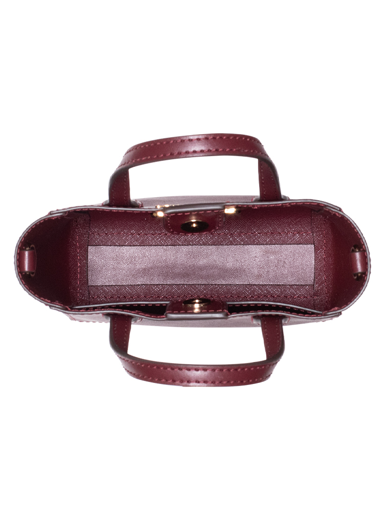 Made of saffiano leather. The bag features a magnetic closure that opens to saffiano leather lining with interior one slip pocket, removable card case.