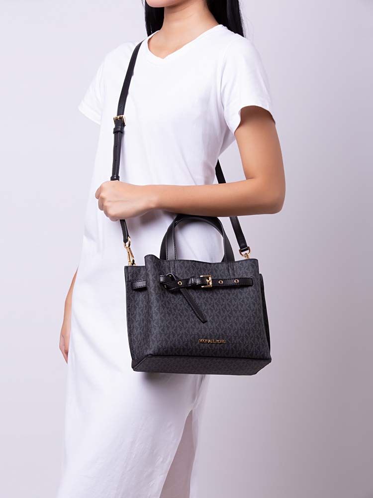 Wherever whenever—this satchel works hard and reads chic. Elegantly streamlined and crafted from Signature-print canvas this everyday handbag is designed in a sizeable silhouette punctuated by a belted silhouette and gold-tone hardware.