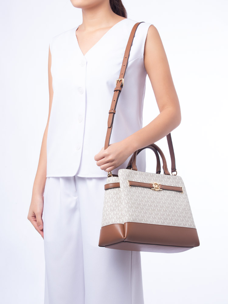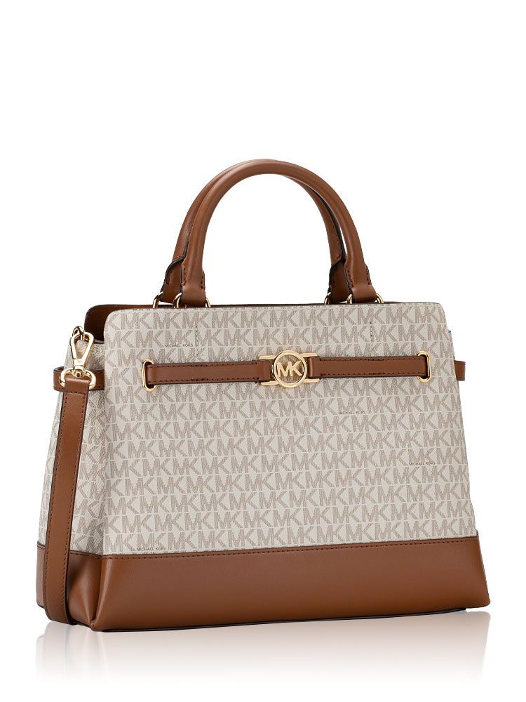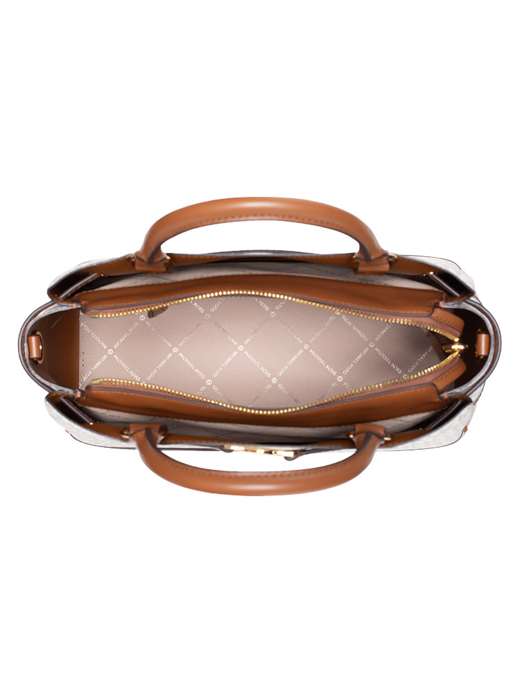 Signature coated canvas with smooth leather. The bag features a zip closure that opens to polyester lining with one zip pocket, exterior two slip compartment, and double handles.
