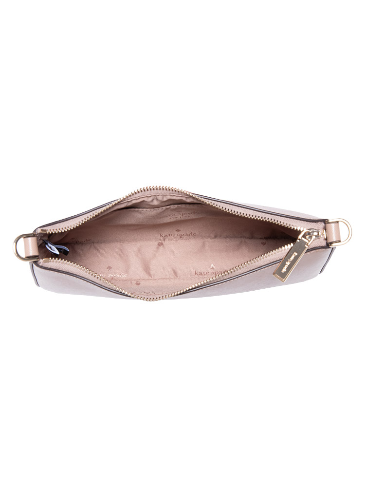 Made of saffiano leather. The bag features a zip closure that opens to two way spade jacquard lining with interior one slip pocket and two bags.