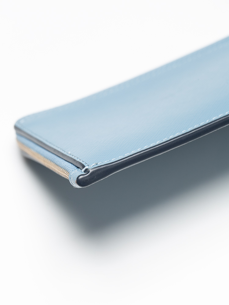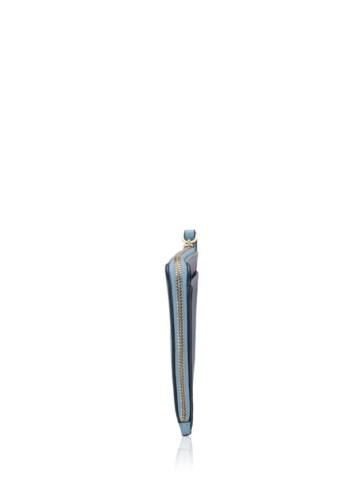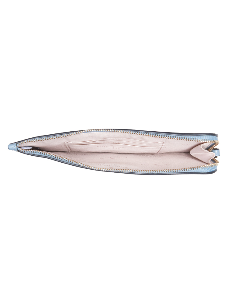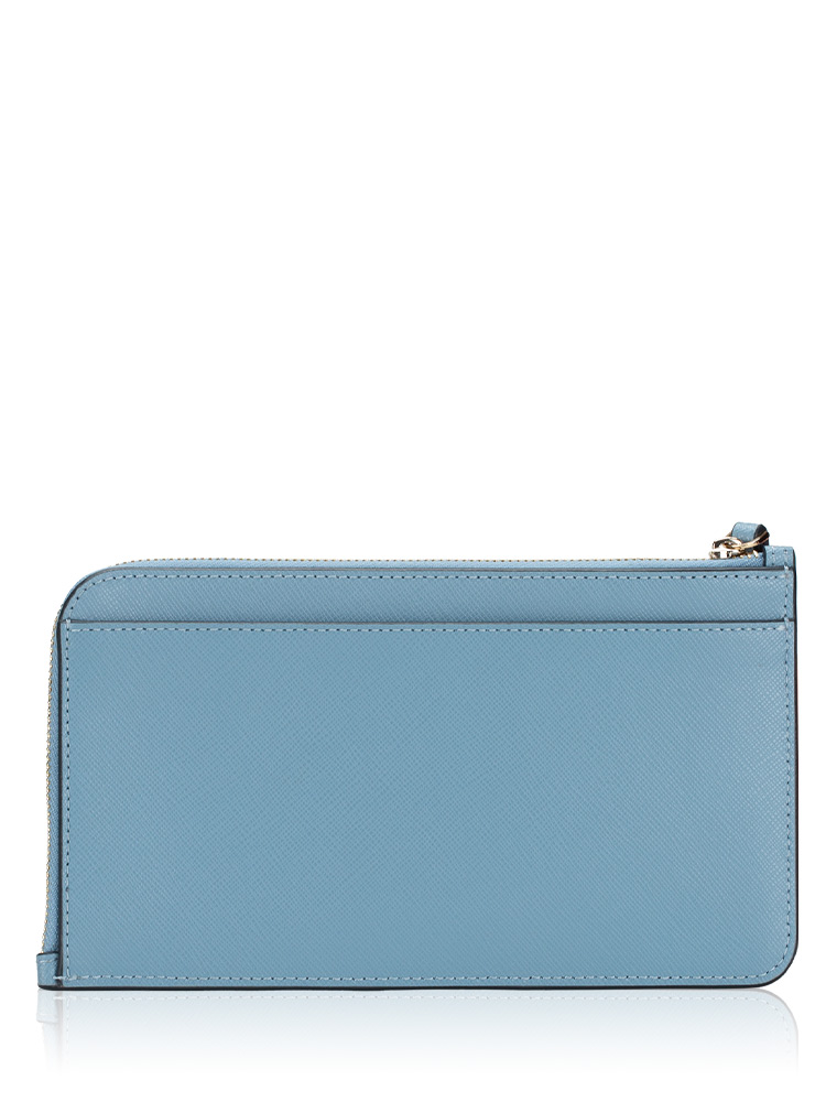 Made of saffiano leather. The wristlet features a zip closure that opens to two way script logo lining with interior three card slots and exterior one slip pocket at back.