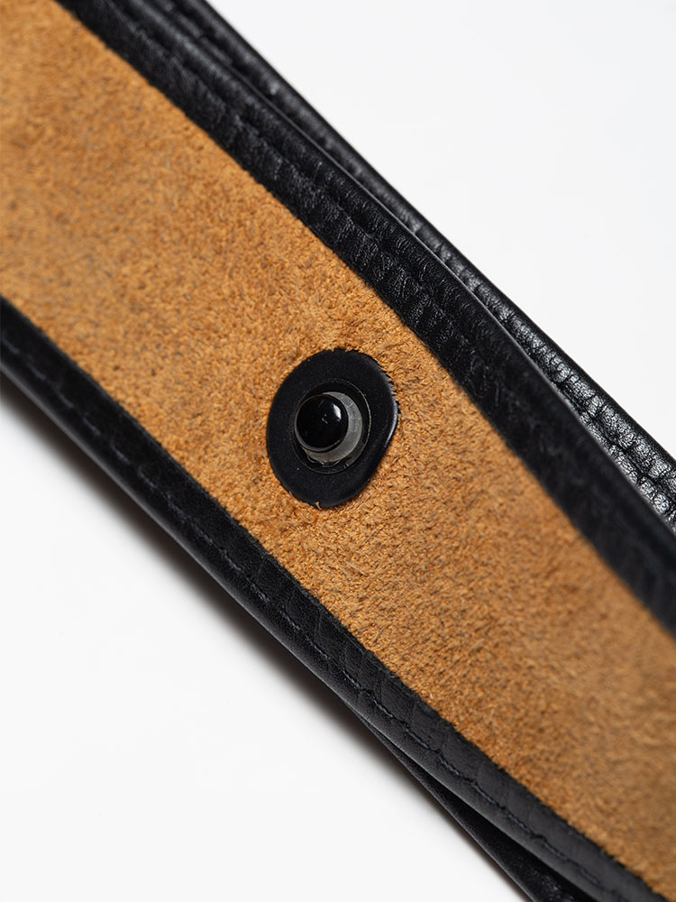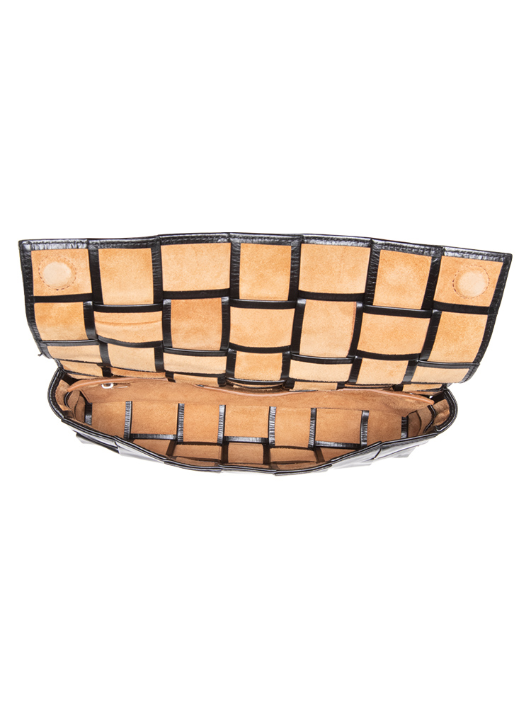 Crafted of tightly woven calfskin leather. The bag features a black adjustable crossbody strap with a front flap that opens to a suede interior with a zipper pouch.