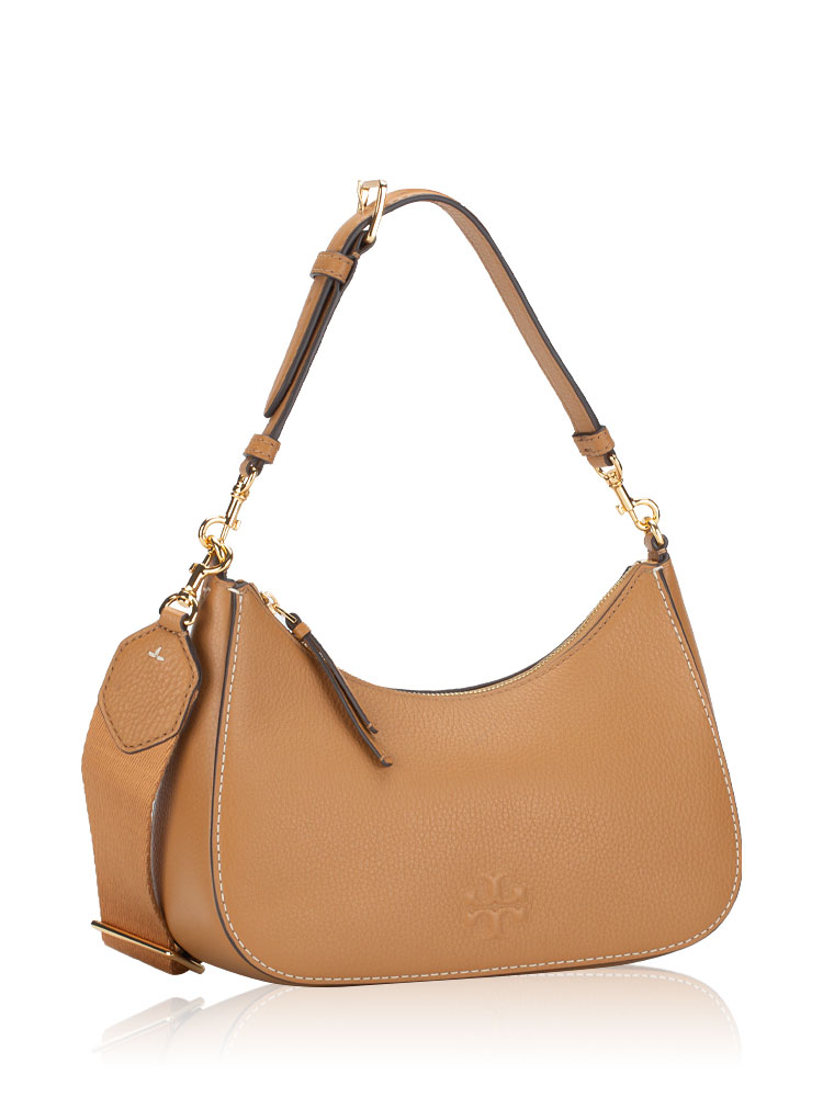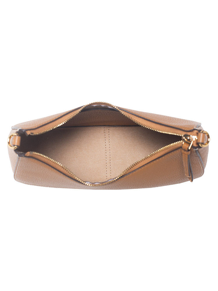 Made of pebbled leather. The bag features a zip closure that opens to suede lining with one slip pocket, adjustable and removable shoulder strap, adjustable and removable long strap.