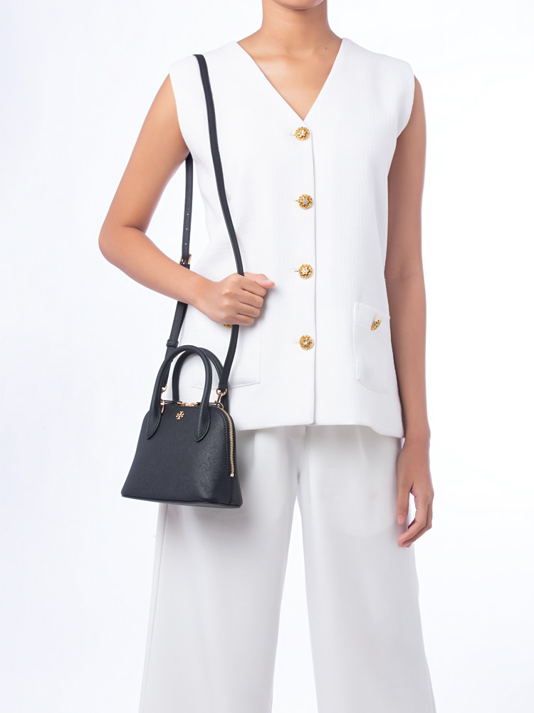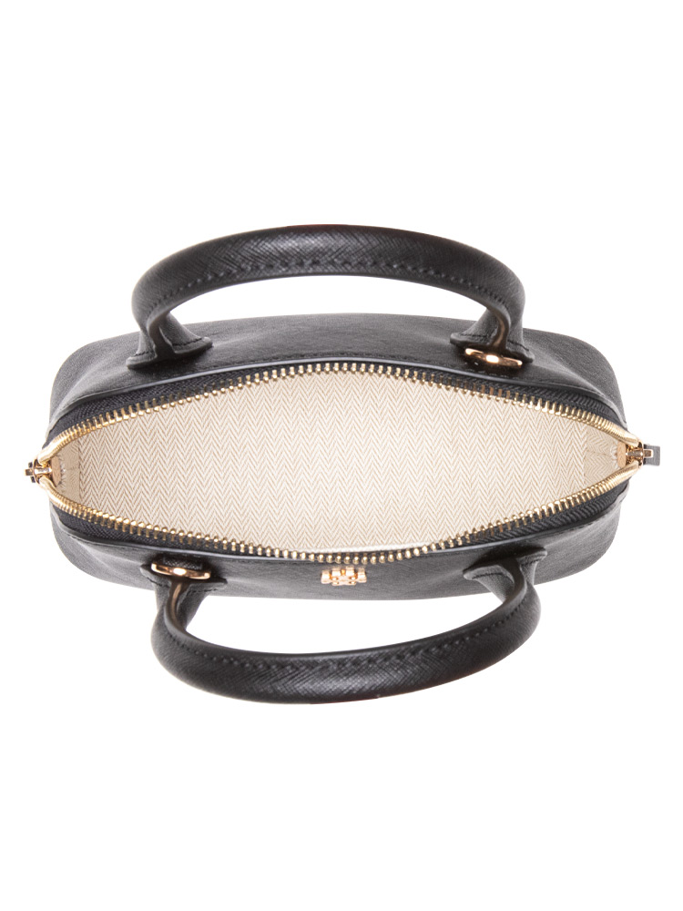 Made of saffiano leather. The bag features a zip closure that opens to fabric lining with interior one slip pocket.
