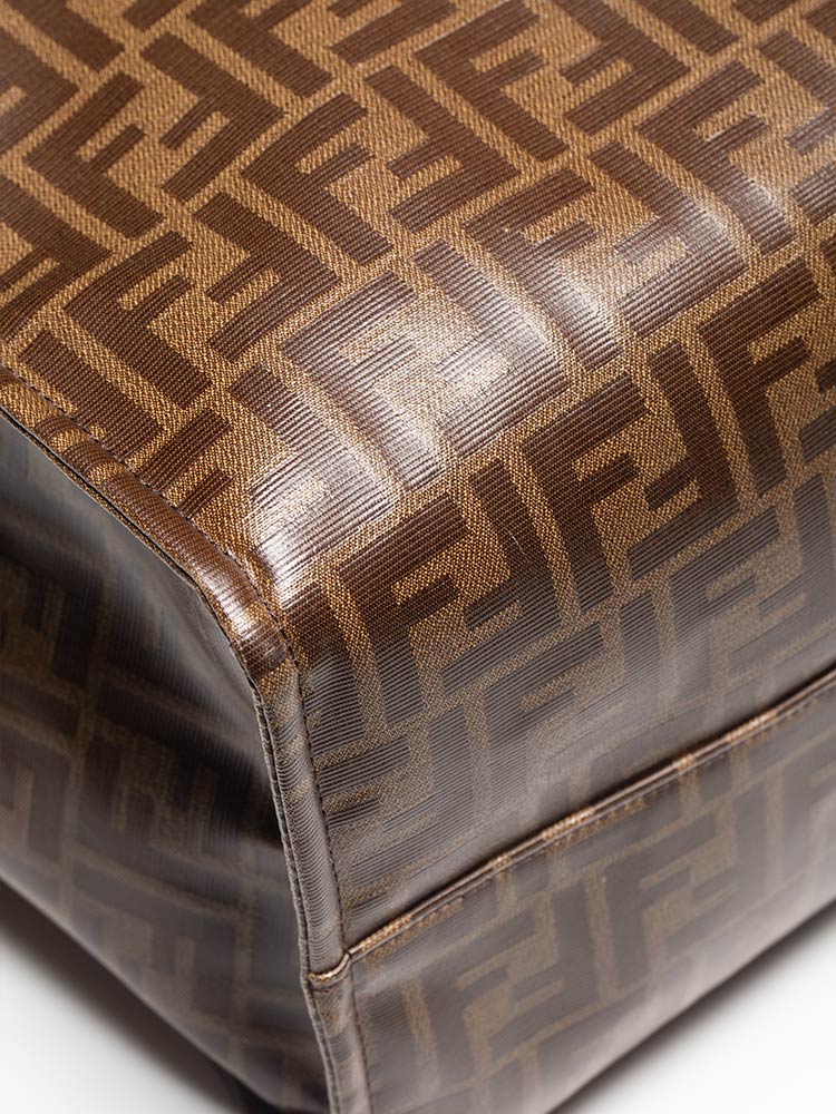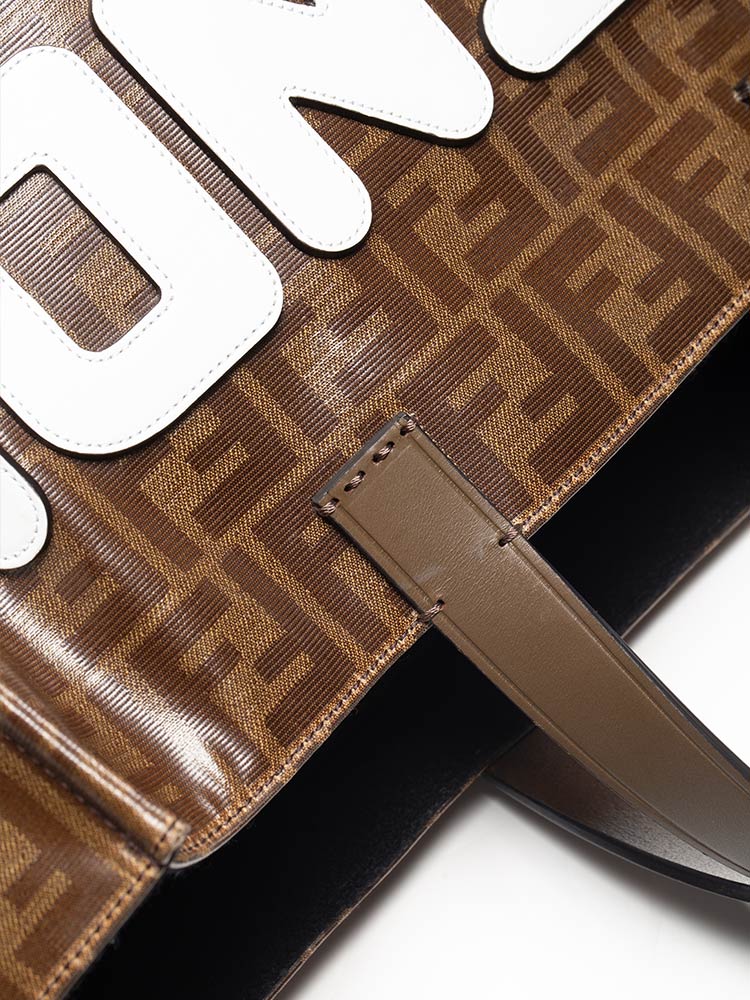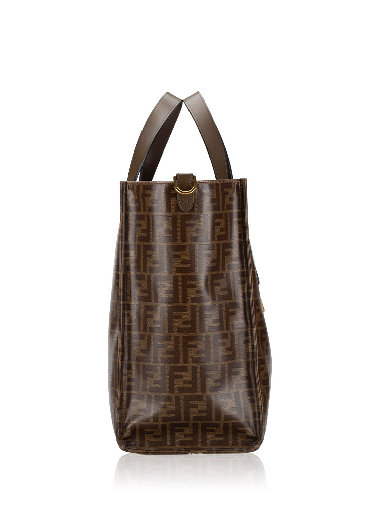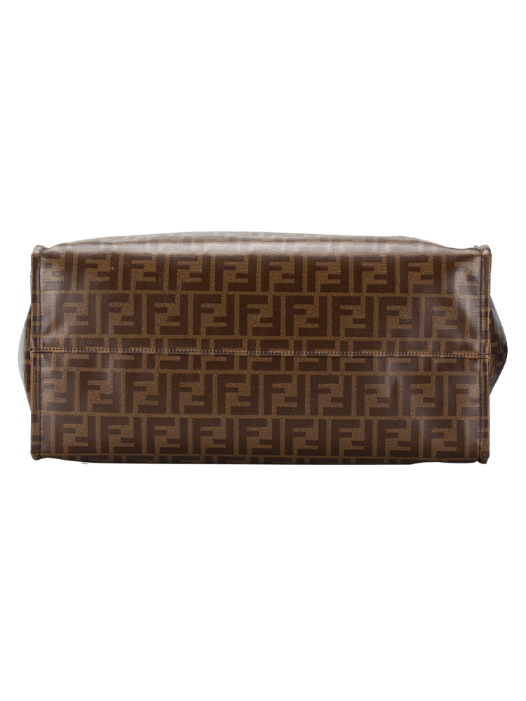 Crafted of Fendi FF motif glazed coated canvas . The bag features leather top handles and has a broad opening to a spacious fabric interior with a hanging zipper pocket.