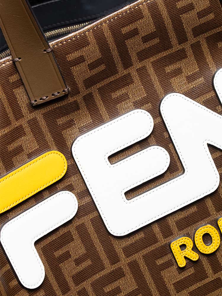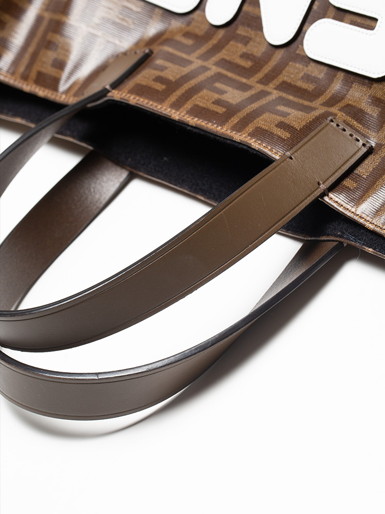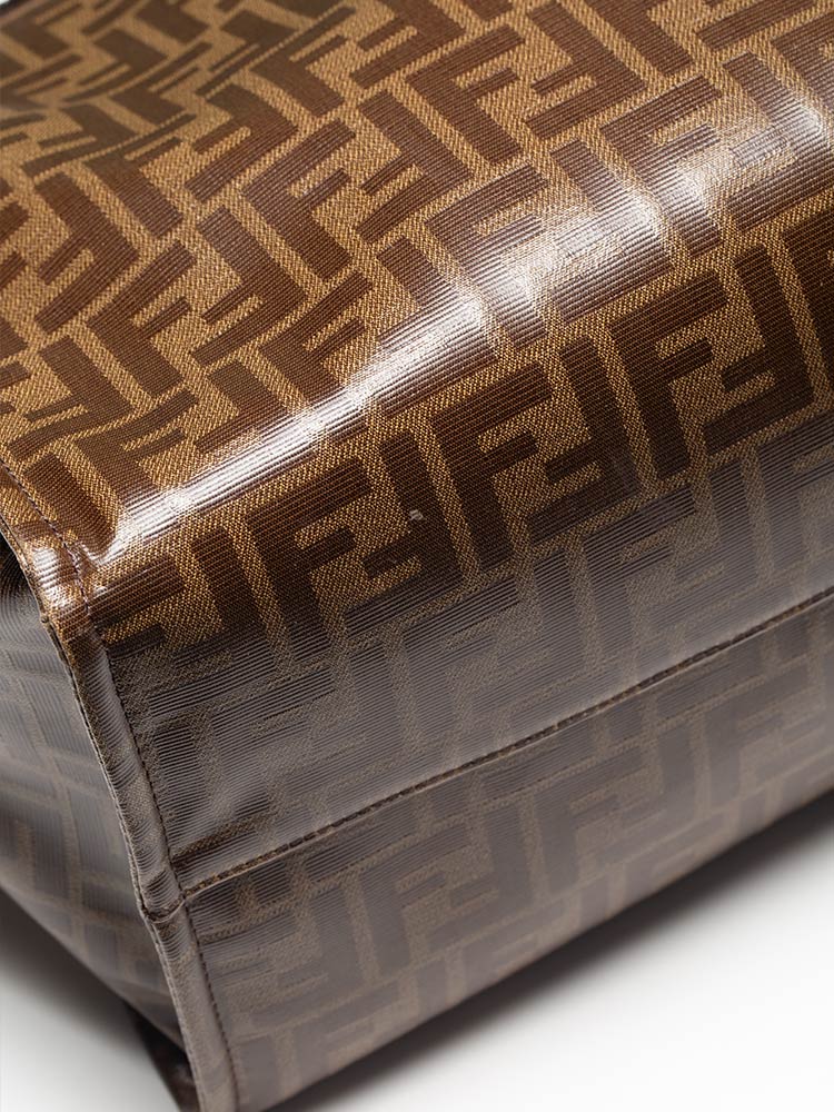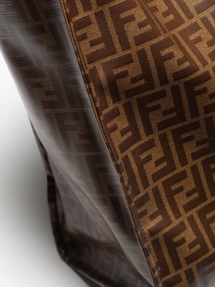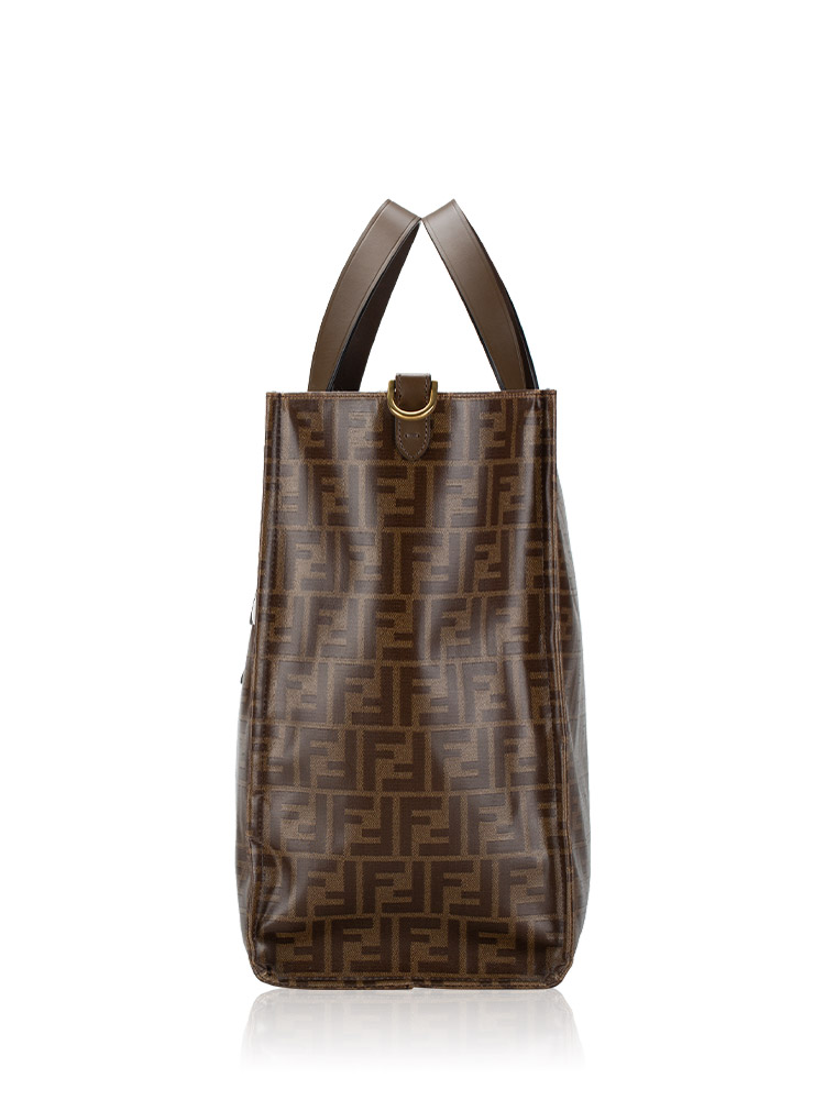 Crafted of Fendi FF motif glazed coated canvas . The bag features leather top handles and has a broad opening to a spacious fabric interior with a hanging zipper pocket.