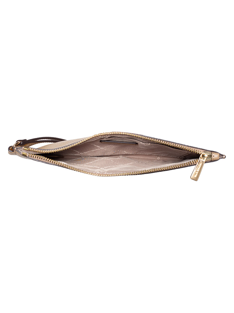 Made of pebble leather with logo polyester lining. The wristlet features an open zip closure, gold tone hardware, and one slip pocket.