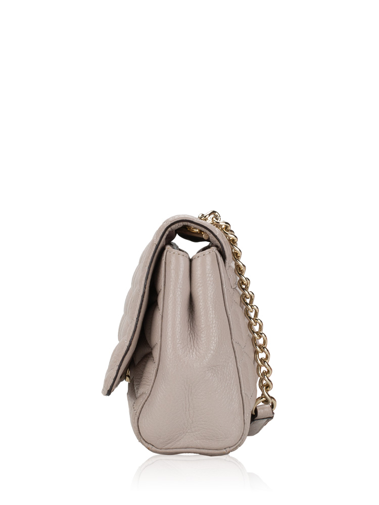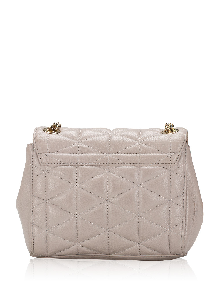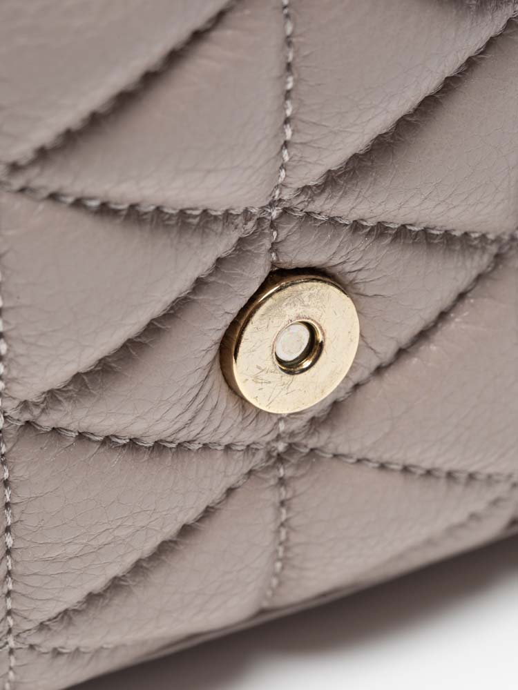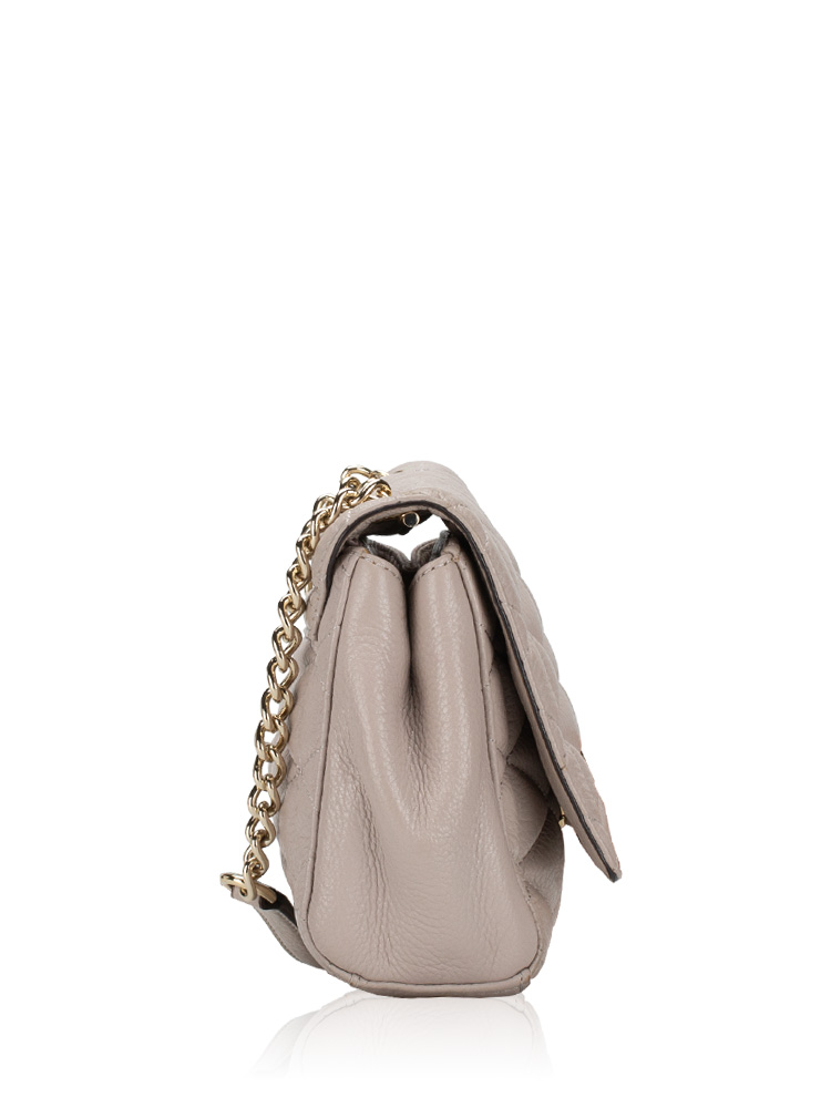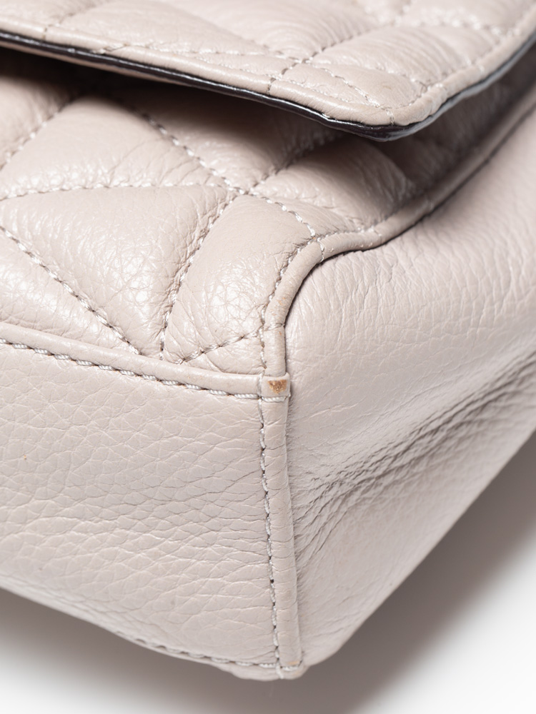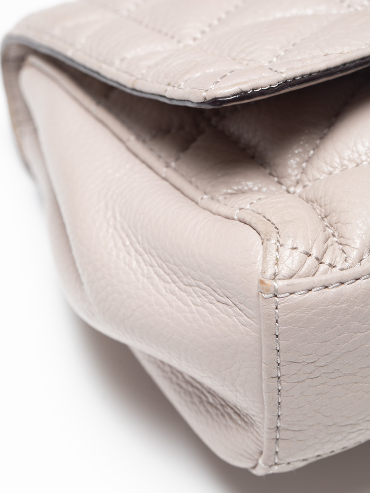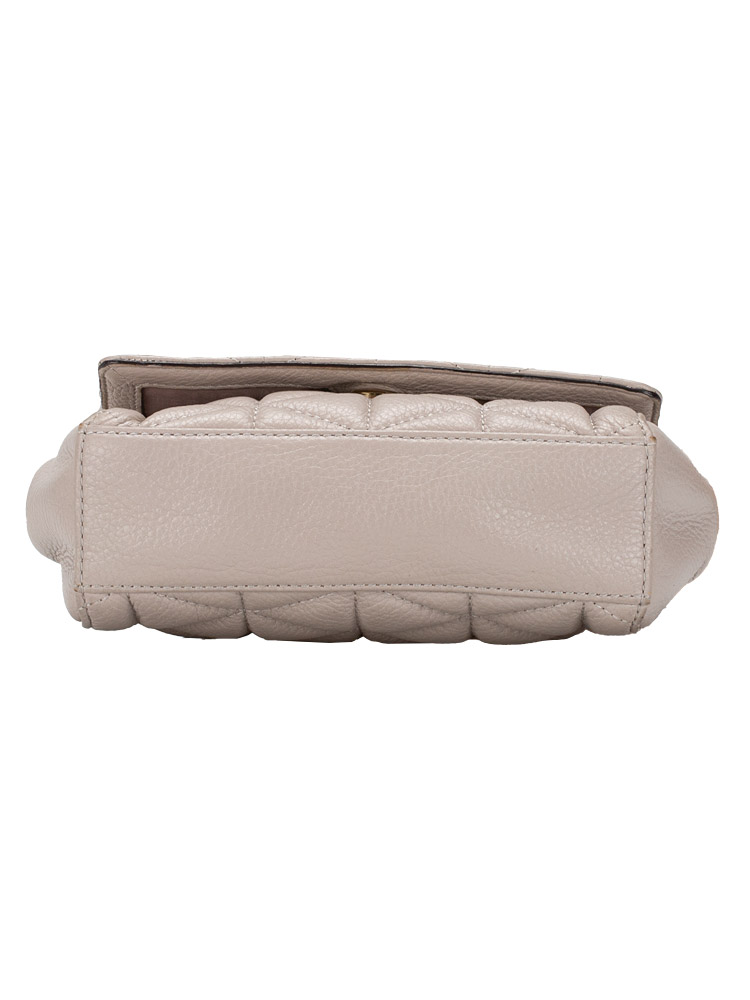 Made of quilted leather. The bag features a magnetic closure that opens to jacquard lining with interior one slip pocket and exterior one slip pocket at back.