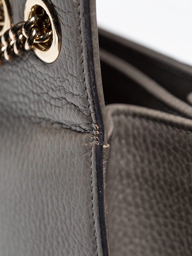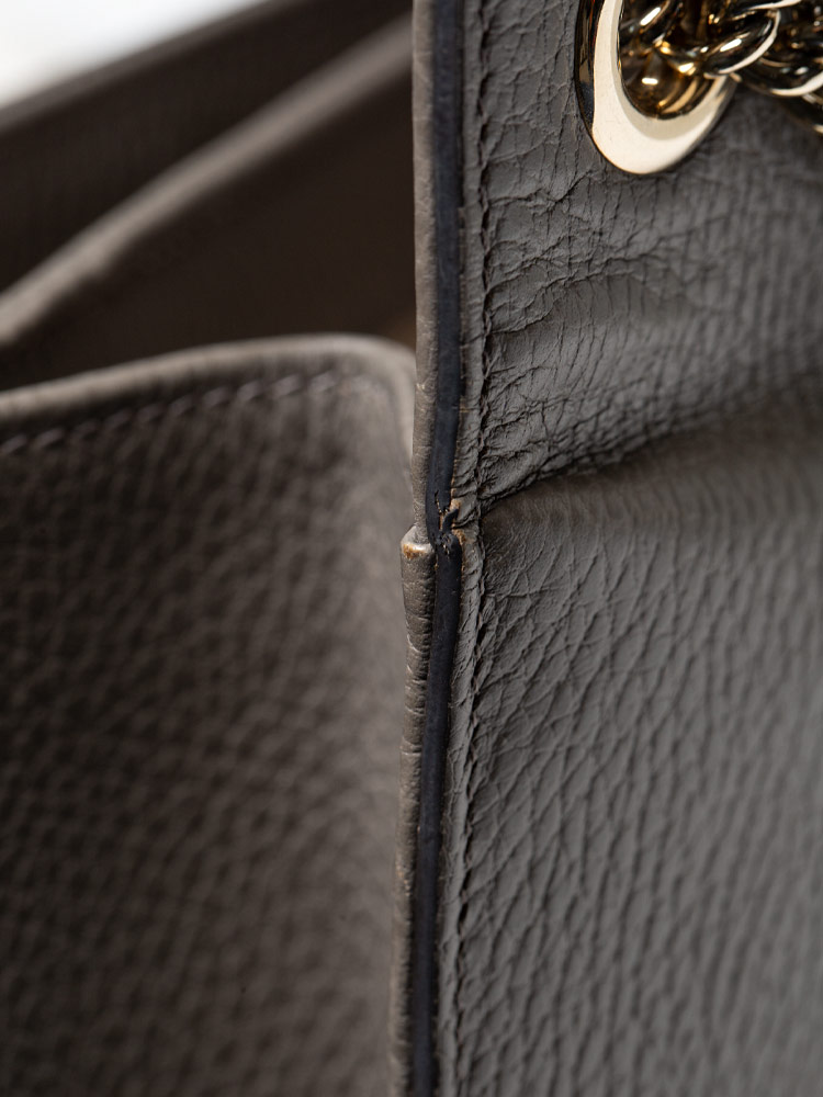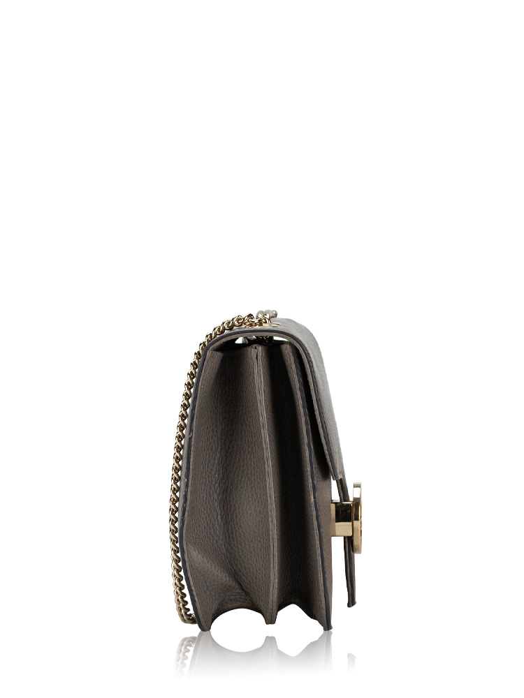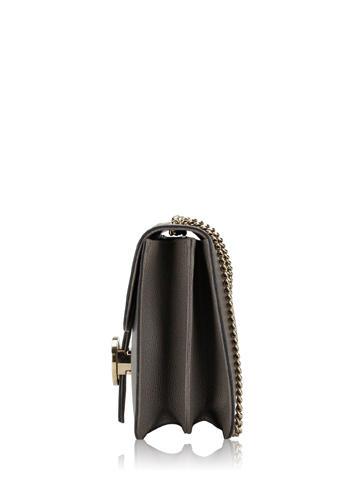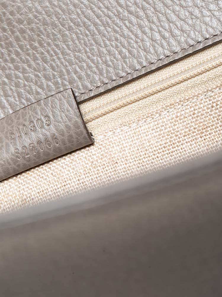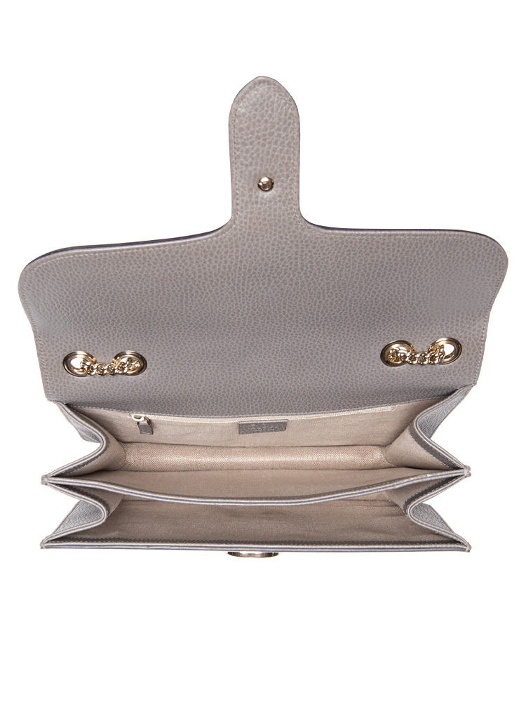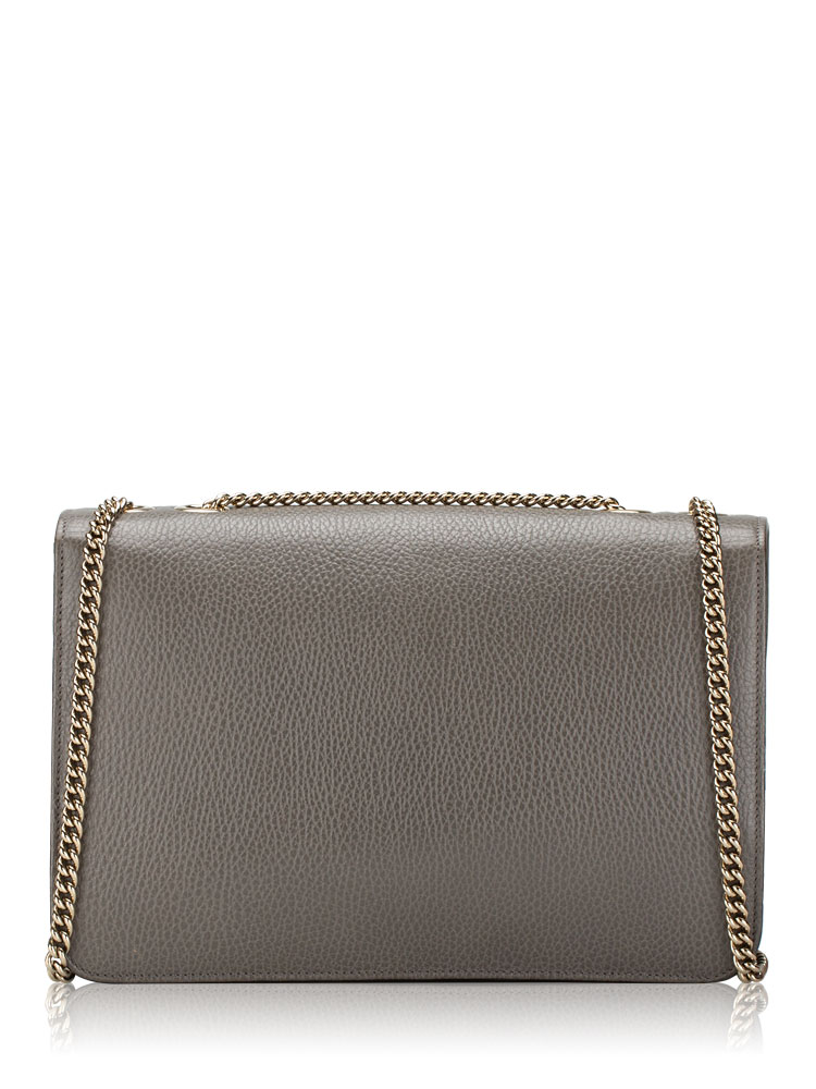 Crafted of calfskin leather. It features a polished gold chain link shoulder strap with a leather pad, and interlocking GG flip-lock on the crossover flap. This opens the bag to a partitioned fabric interior with a zipper pocket.