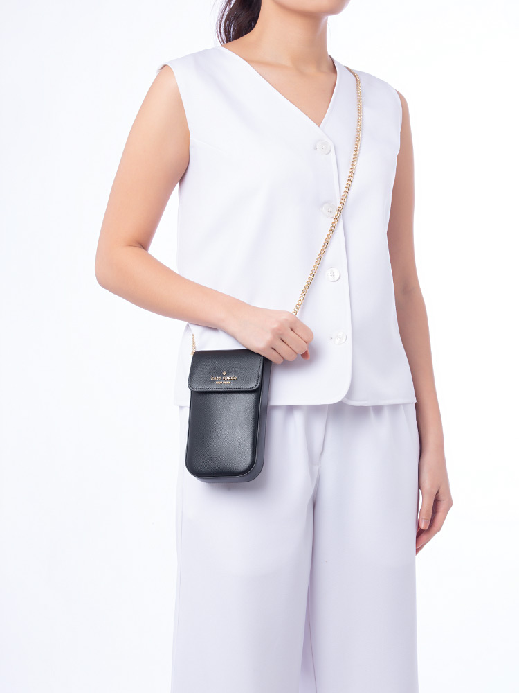 Made of saffiano leather. The bag features a magnetic closure that opens to two way script logo lining with interior two card slots.