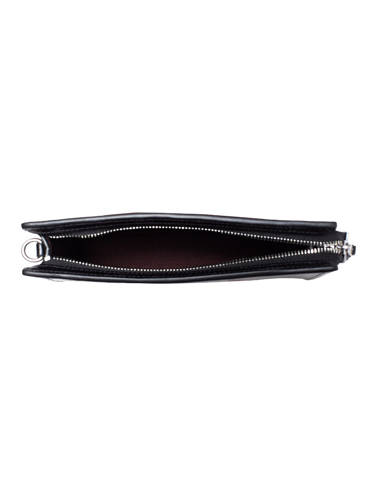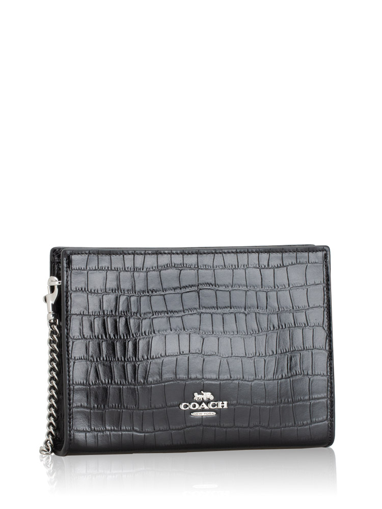 Made of crocodile-embossed leather. The bag features a zip closure that opens to fabric lining with interior two card slots, removable chain strap.