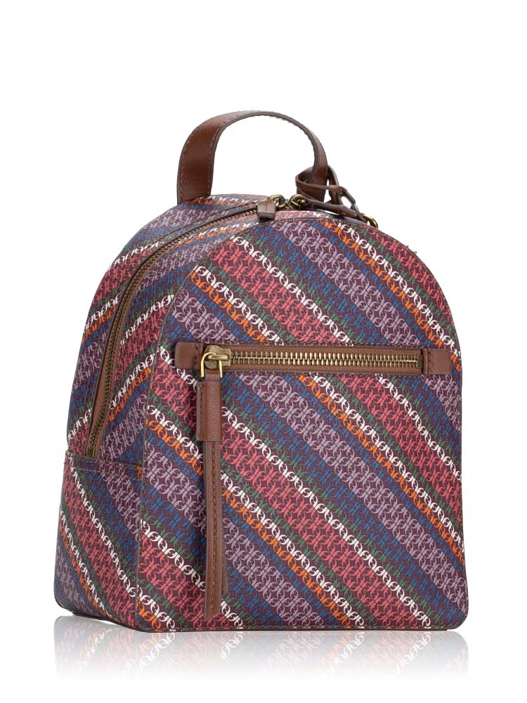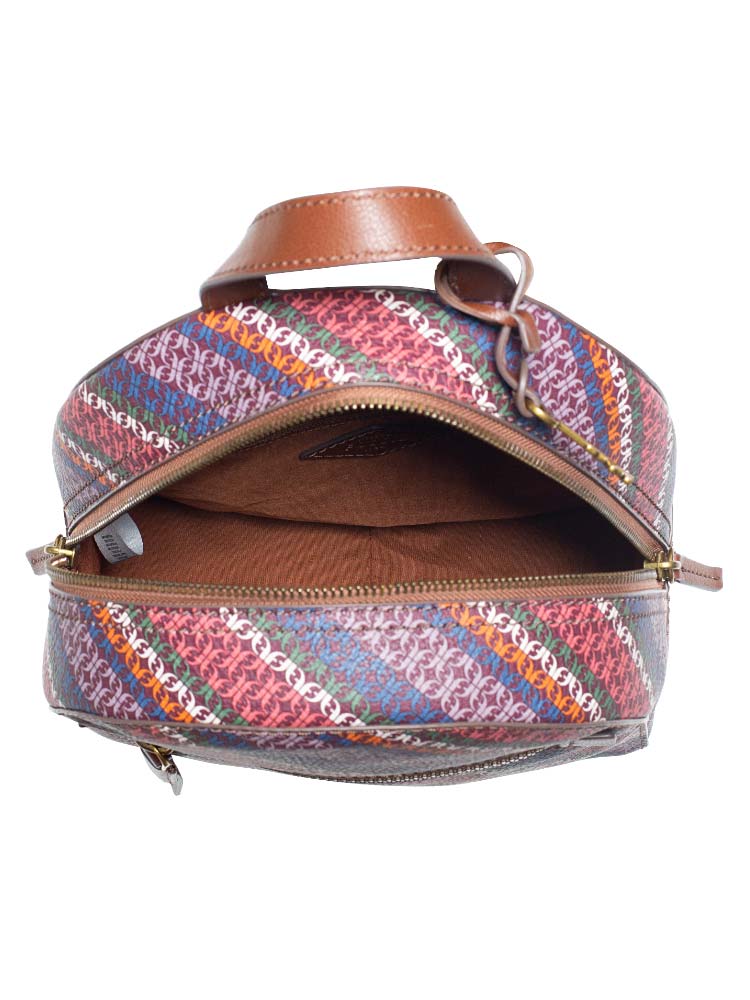 Made of printed pvc. The backpack features a zip closure that opens to polyester lining with interior one zip pocket, two slip pockets and exterior one zip pocket at front.