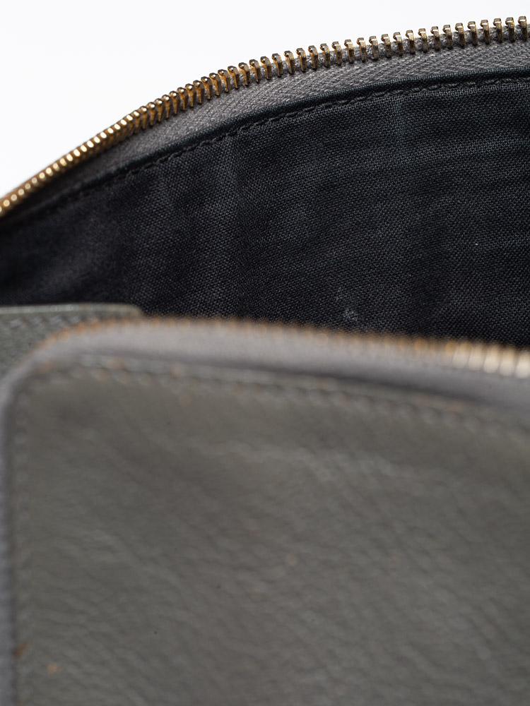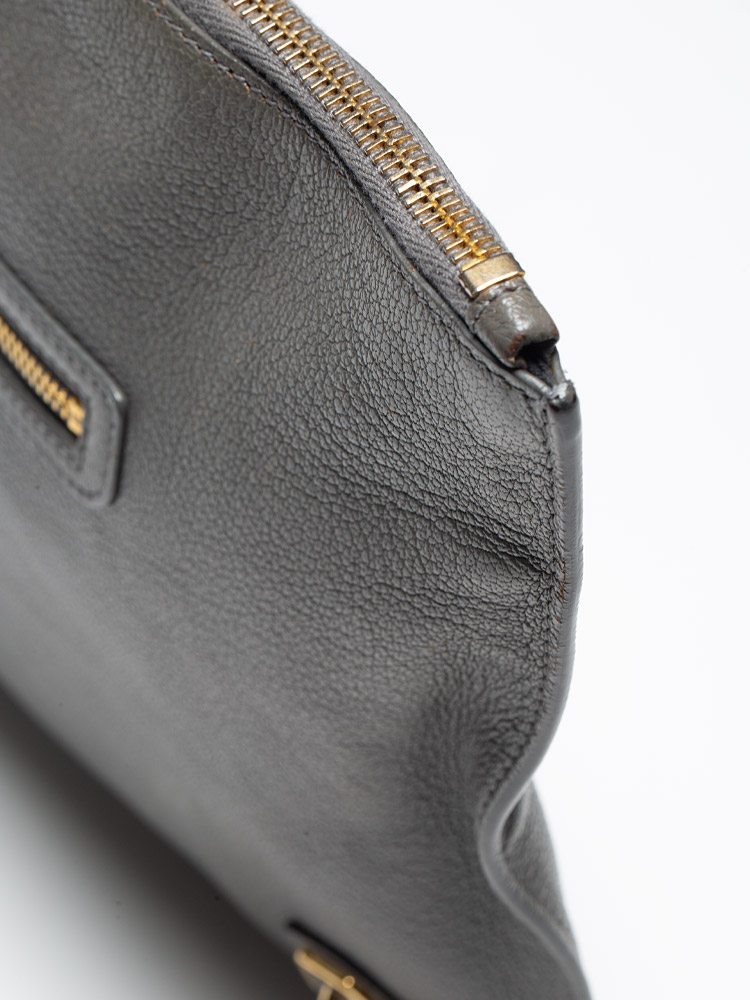 This pouch is crafted of distressed goatskin leather. This clutch features a facing zipper pocket, a leather zipper pull tassel, and gold hardware including buckles. The top zipper opens to a black fabric interior.