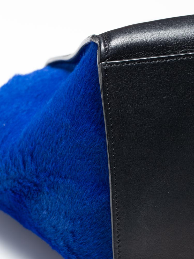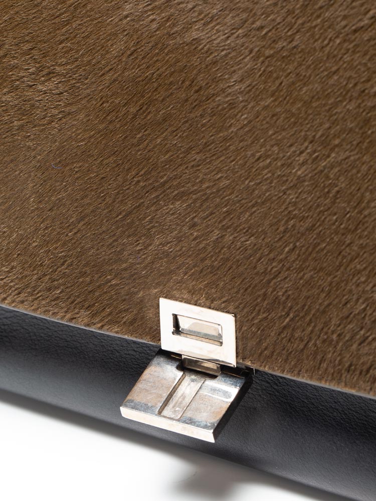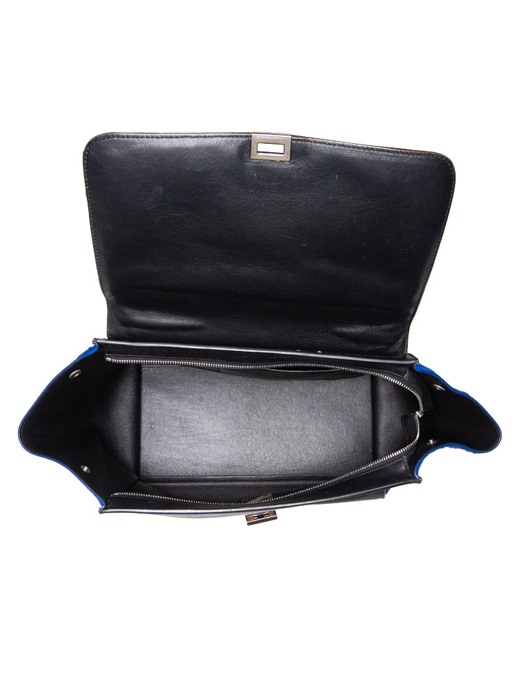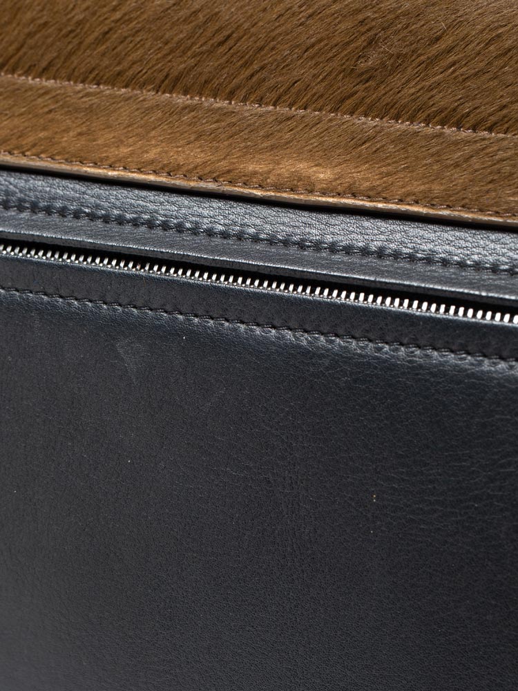 Crafted of textured leather, blue-colored pony hair wings, and a crossover flap with pony hair. The silver latch opens the facing flap to a zipper interior and a leather interior with hanging patched pockets.