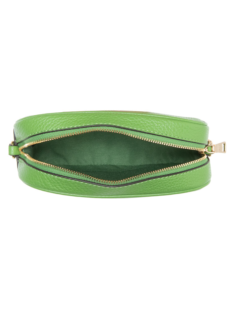 Made of pebble leather. The wristlet features a zip closure that opens to fabric lining with two card slots, handle strap drop 11 cm.
