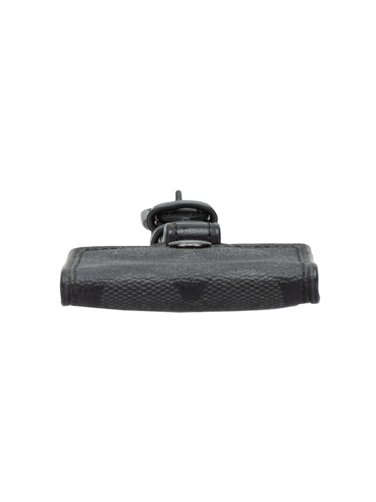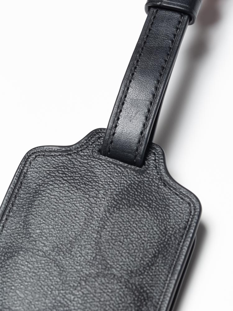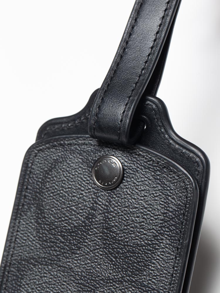 Signature coated canvas and smooth leather. The tag features a button closure that opens to fabric lining with one slip id window.
