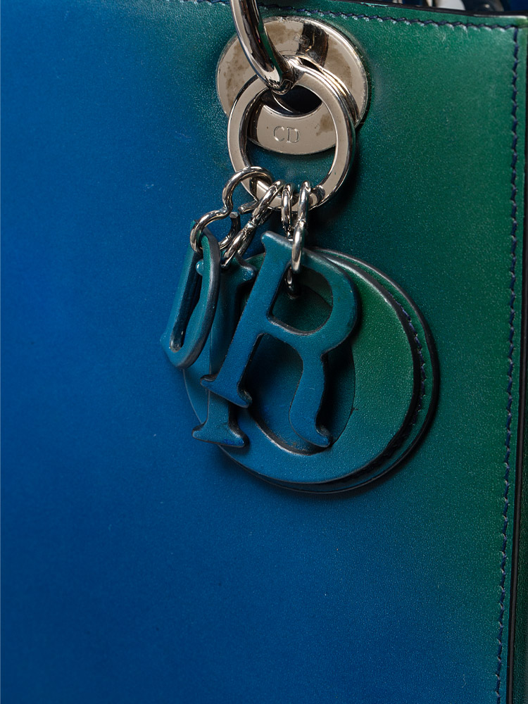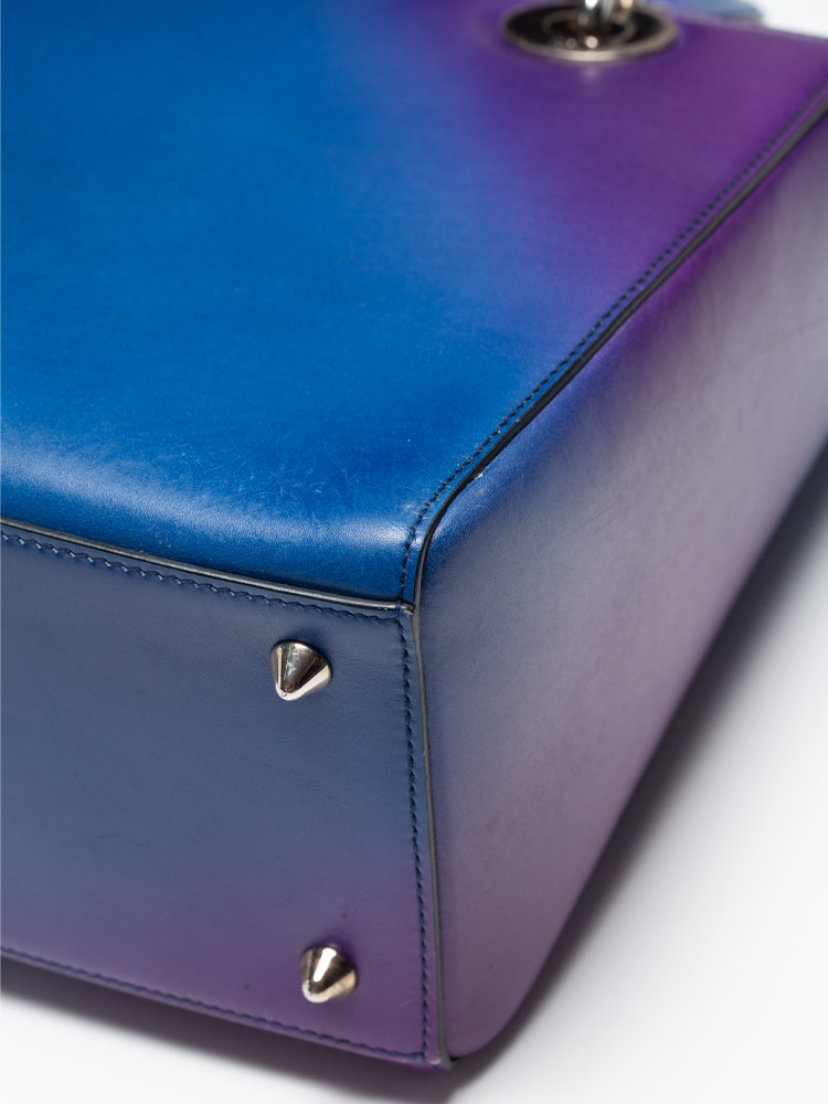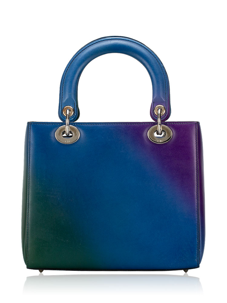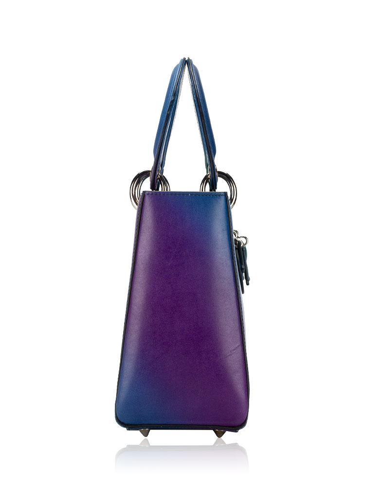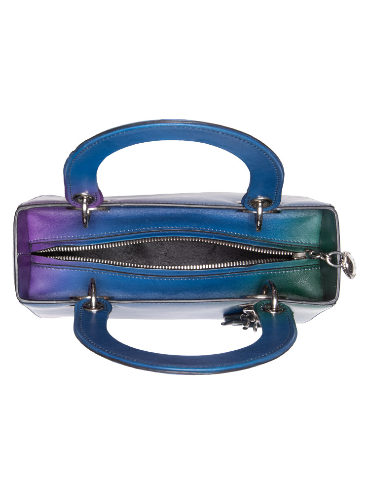 This bag is crafted of polished box calf leather in a gradient tones of purple, blue and green. Features reinforced leather top handles, an optional shoulder strap, and polished silver hardware including a Dior initials charm.