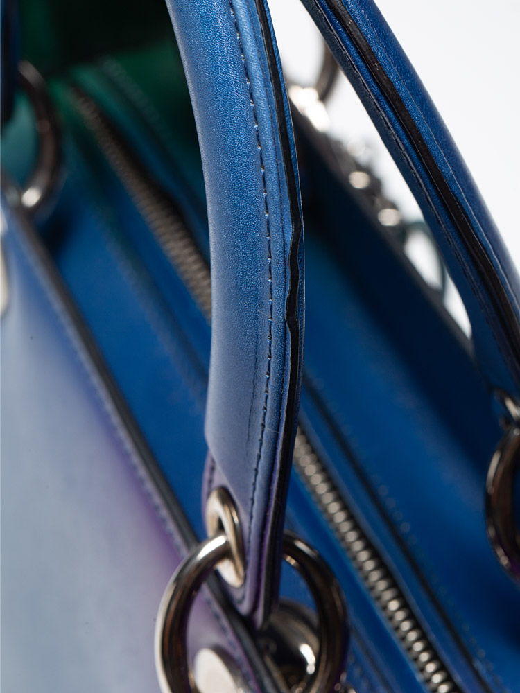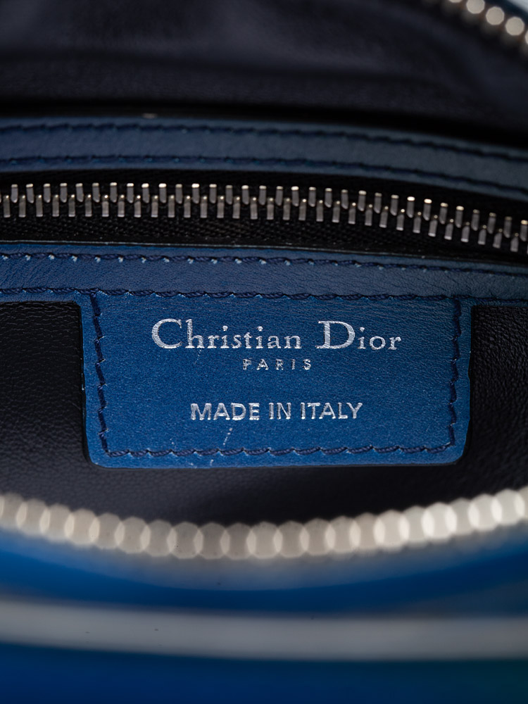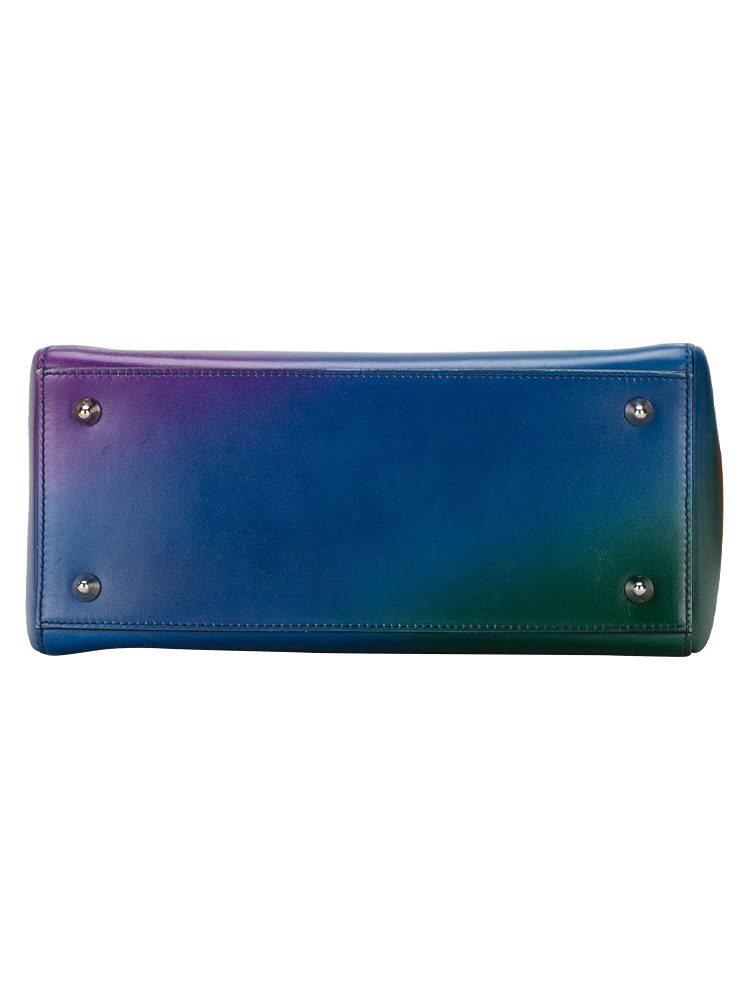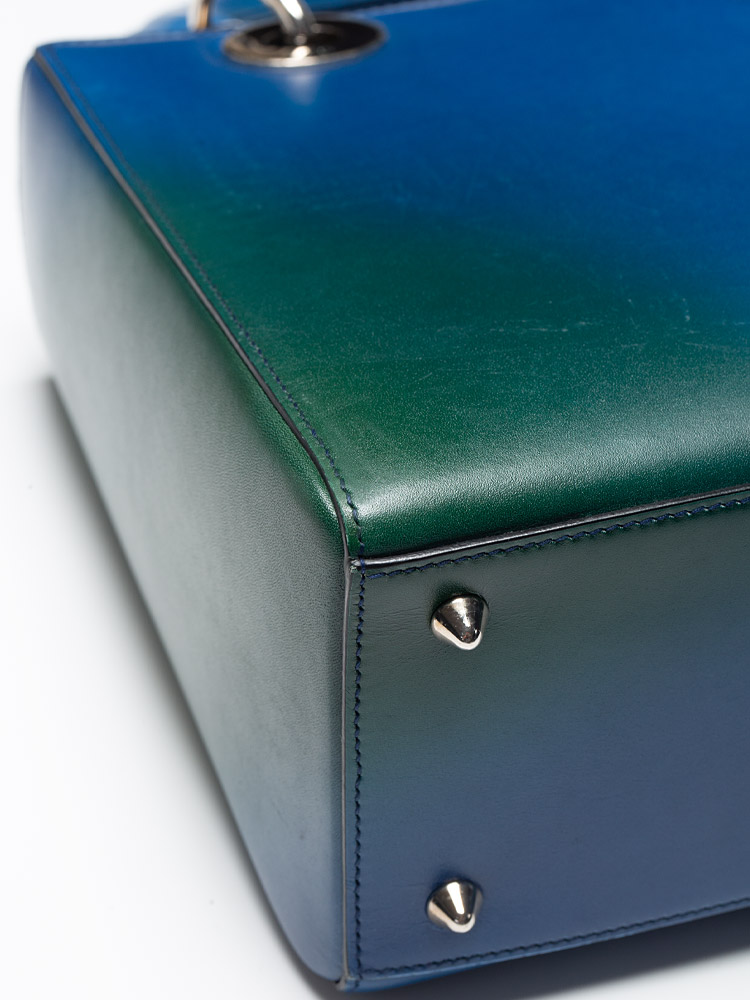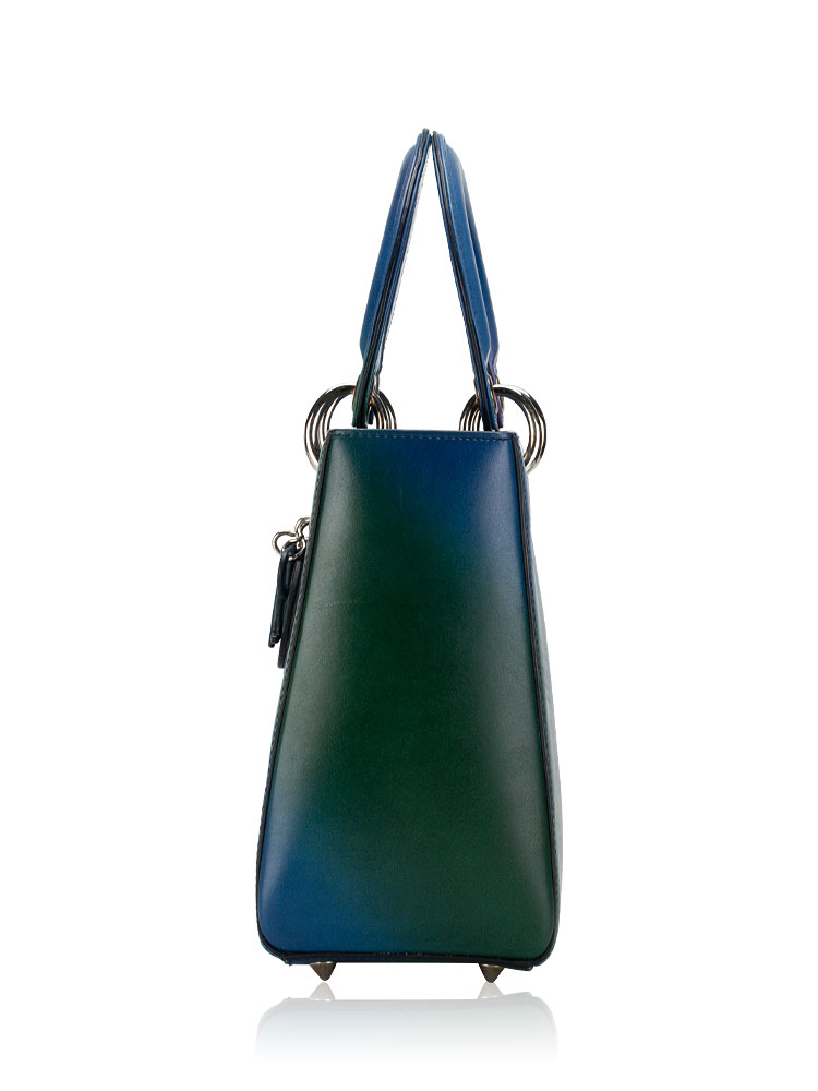 This bag is crafted of polished box calf leather in a gradient tones of purple, blue and green. Features reinforced leather top handles, an optional shoulder strap, and polished silver hardware including a Dior initials charm.