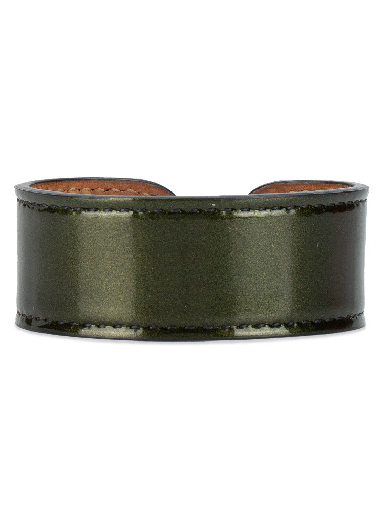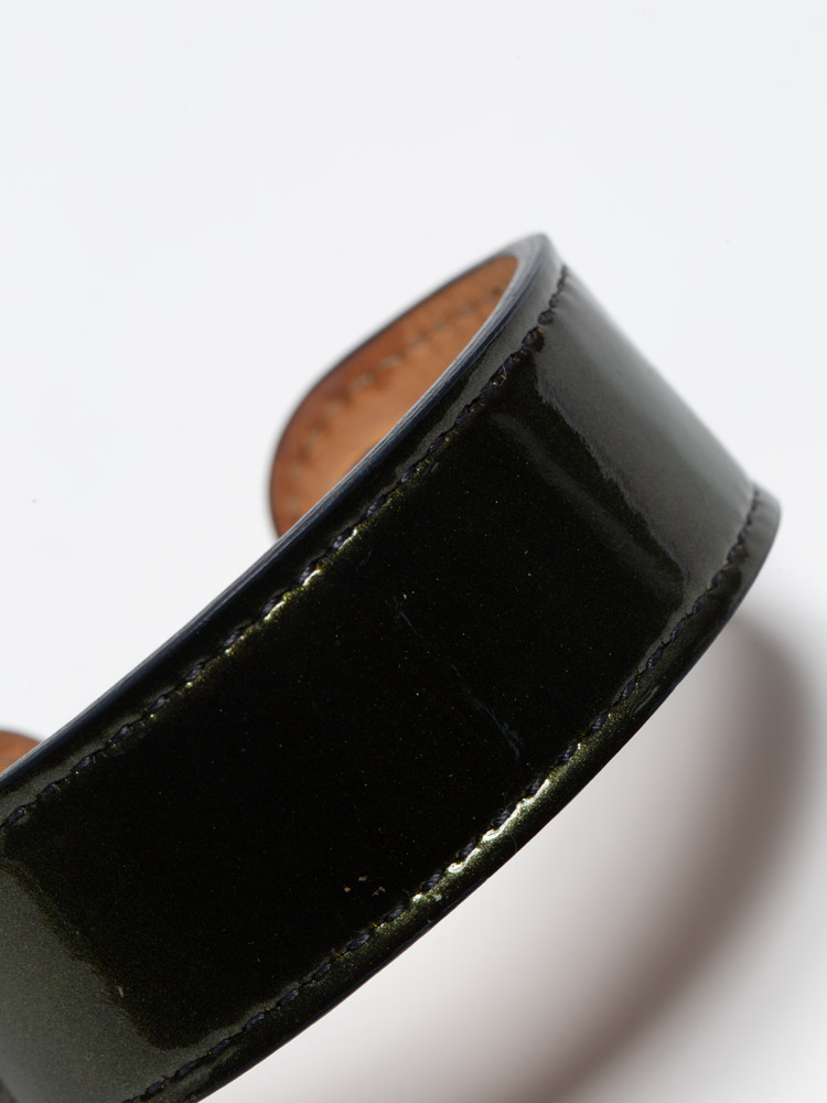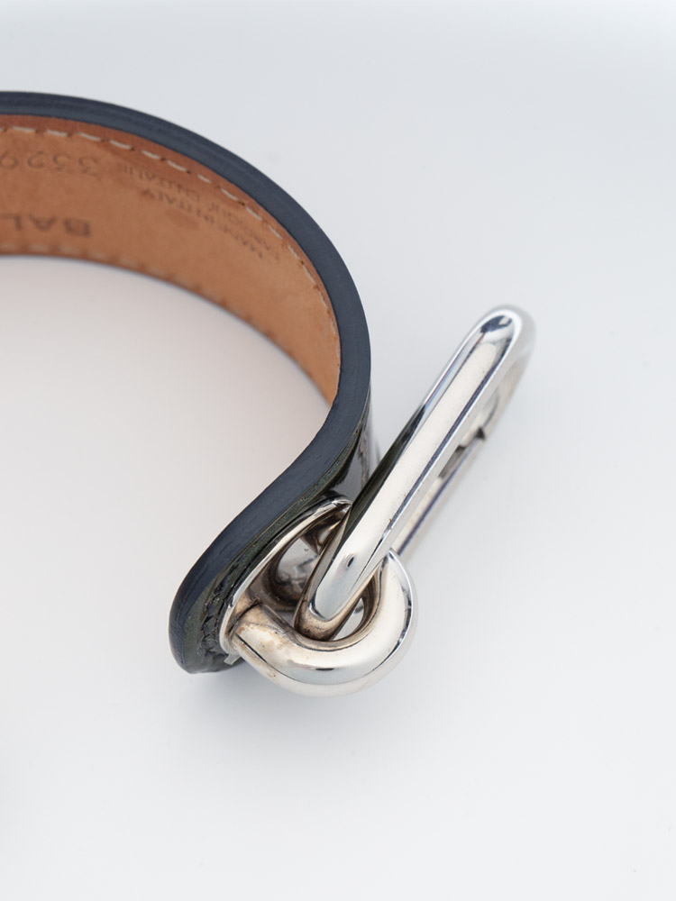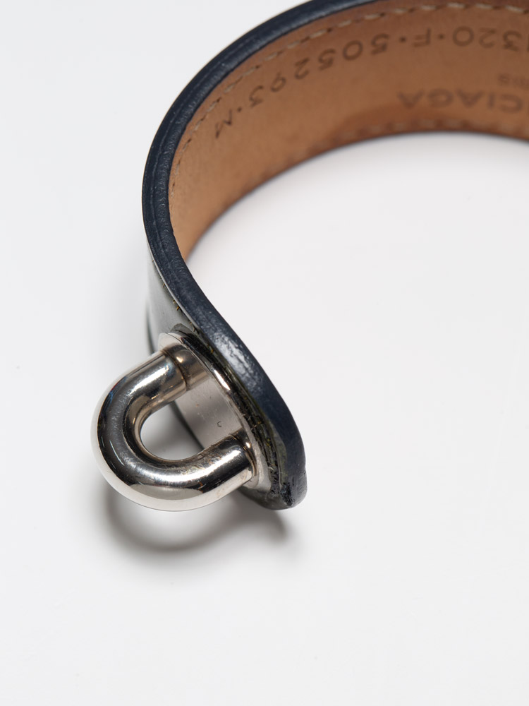 This bracelet is crafted of Vernis leather in grey with a polished silver snap hook clasp.